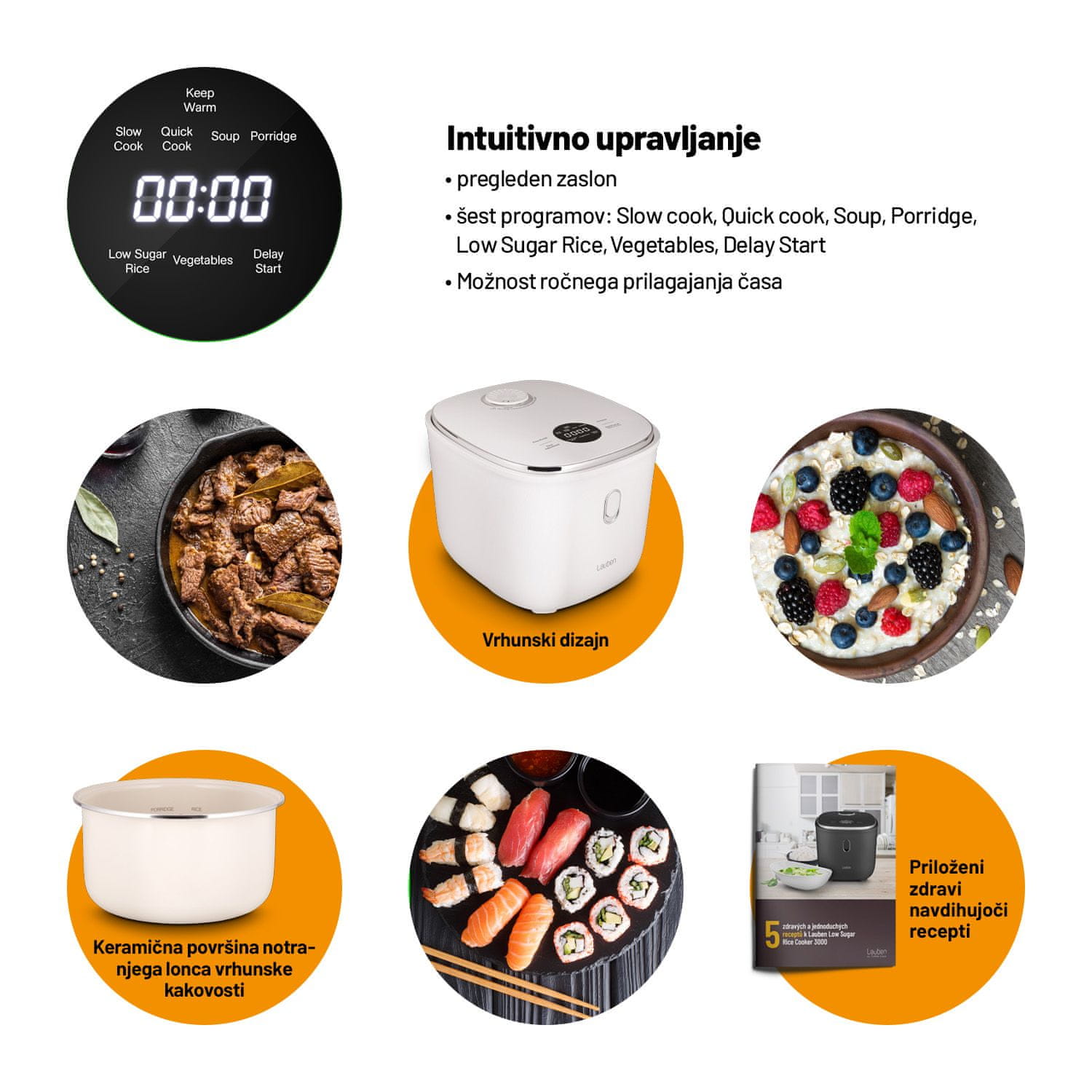 Začetek zdravega življenjskega sloga je zdaj veliko lažji z večnamenskim kuhalnikom riža Lauben Low Sugar Rice Cooker 3000 WT. Njegova funkcija nizko vsebnost sladkorja zagotavlja odstranitev do 40 % ogljikovih hidratov iz pripravljenega riža. Poleg vseh vrst riža lahko stroj obdeluje tudi na primer stročnice. Preprosto izberite enega od 6 načinov ali ga prilagodite ročno. notranja posoda z vrhunsko keramično površino, ki se ne prijema, zadostuje za kuhanje za vso družino. vklopite funkcijo Keep Warm.