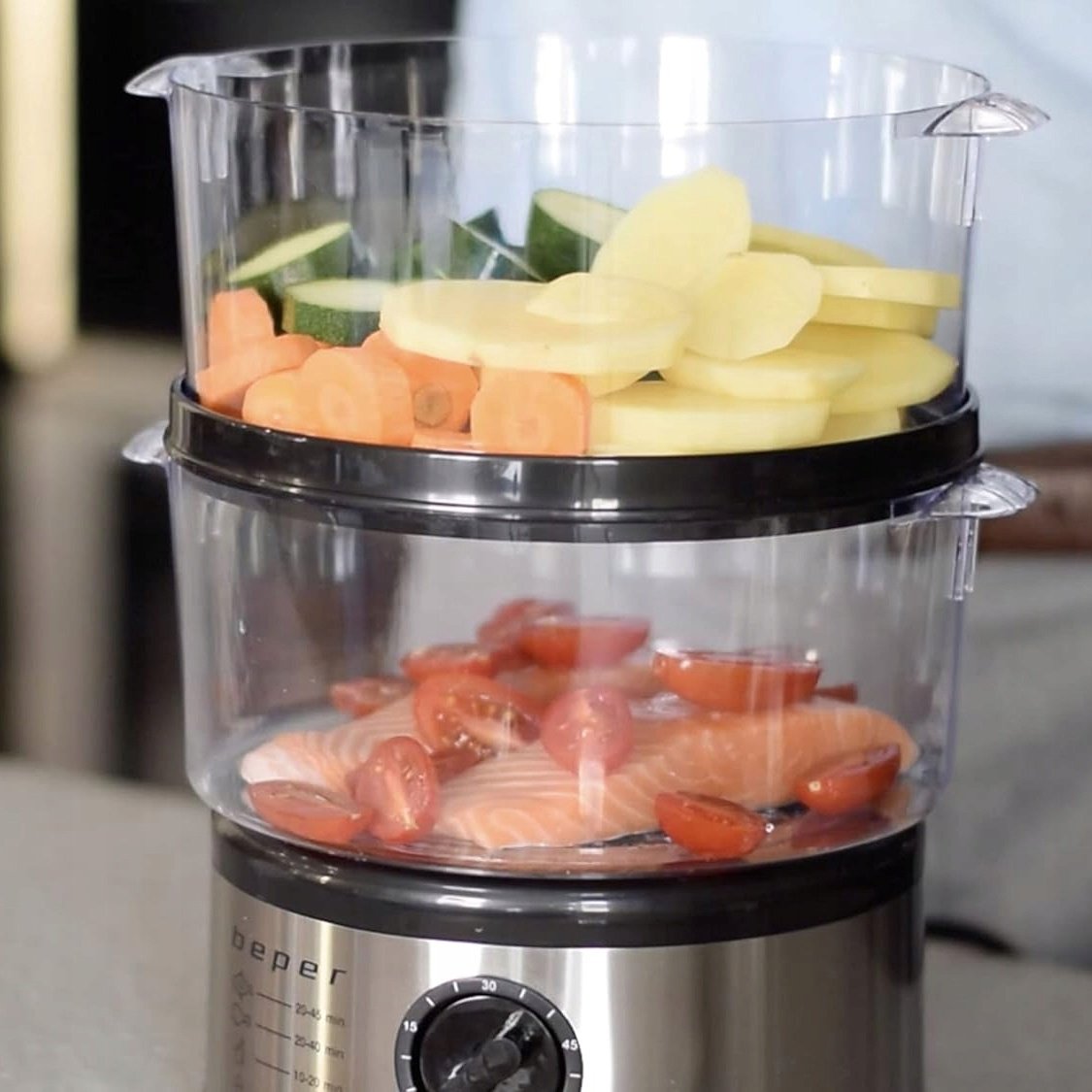 Ta parni kuhalnik daje vašemu kuhanju novo dimenzijo! Odličen je na primer za zelenjavo, meso in ribe. Parni kuhalnik ima 2 nivoja s skupno prostornino 5 litrov. Rezervoar za vodo sprejme 500 ml in ima indikator nivoja vode. Parni kuhalnik se samodejno izklopi, ko zmanjka vode. Na voljo je tudi časovnik, ki ga lahko nastavite za 60 minut naprej. Parni kuhalnik je enostaven za čiščenje in med shranjevanjem zavzame nekaj prostora.
