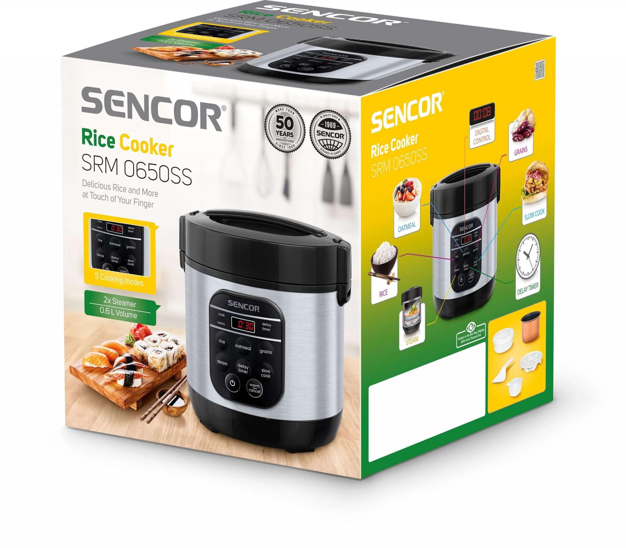 Večfunkcijski kuhalnik rižafunkcijo samodejnega vzdrževanja temperature za 12 ur. SENCOR SRM 0650SS ponuja 5 posebnih programov – za pripravo riža, kaše, stročnic, za kuhanje na pari in funkcijo počasnega kuhanja. 1.5 mm debela notranja posoda zagotavlja enakomerno porazdelitev toplote. Prostornina 0,6 litra je primerna za pripravo 450 g riža. V paketu boste našli 2 parna nastavka, zajemalko za riž in in posodo za riž. Celoten opis