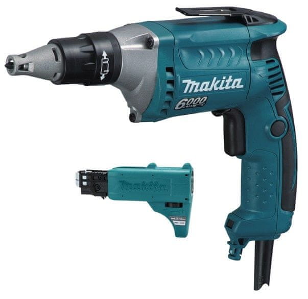 Makita električni vijačnik FS6300JX2 z močjo 570 W, hitrostjo 6000 obr/min, podajalnikom vijakov in LED lučko. Celoten opis