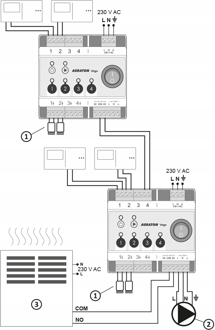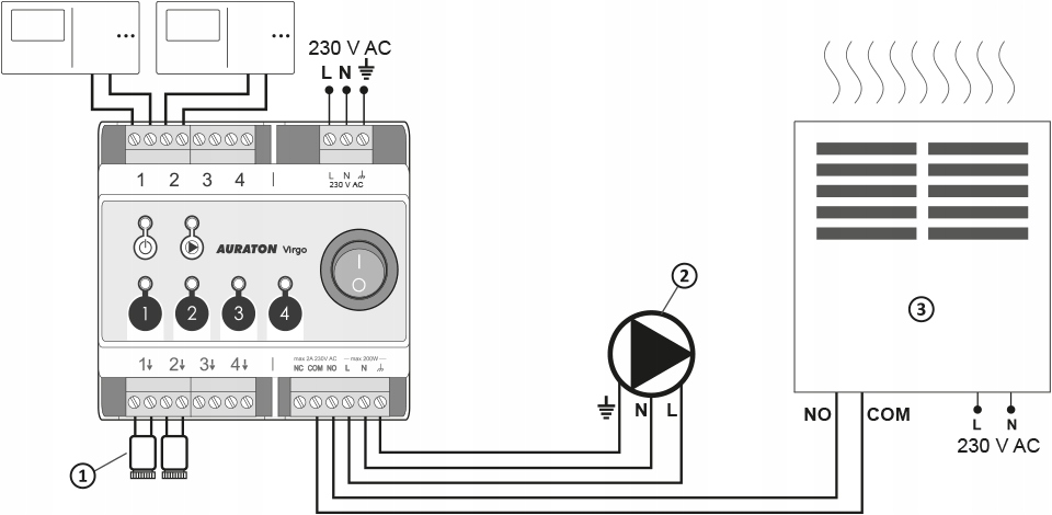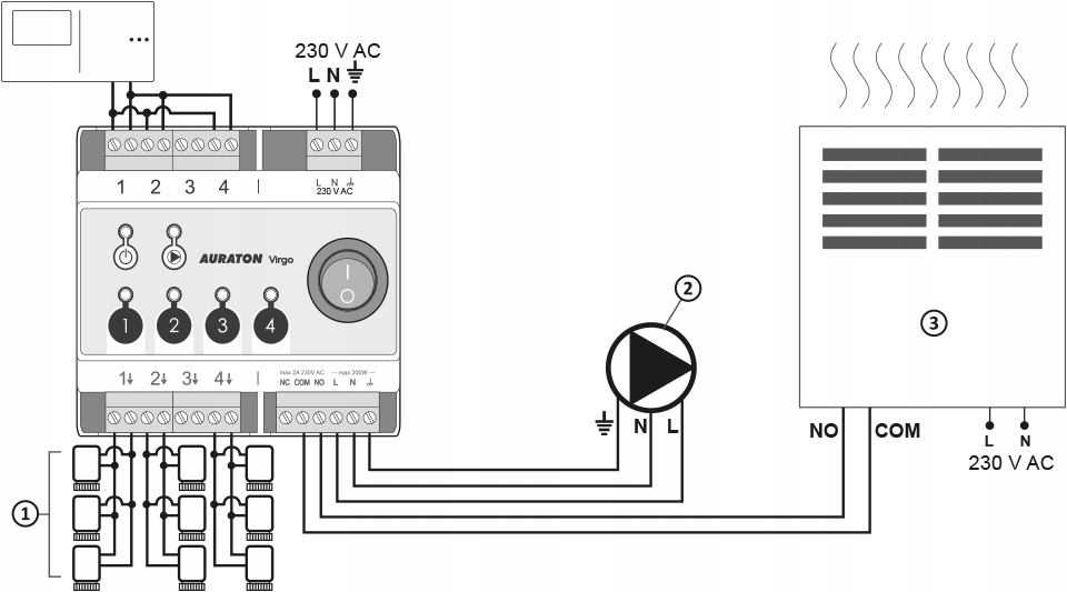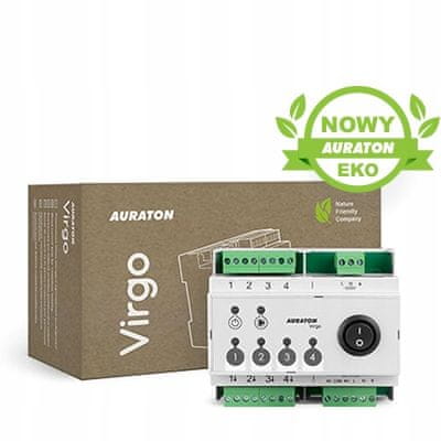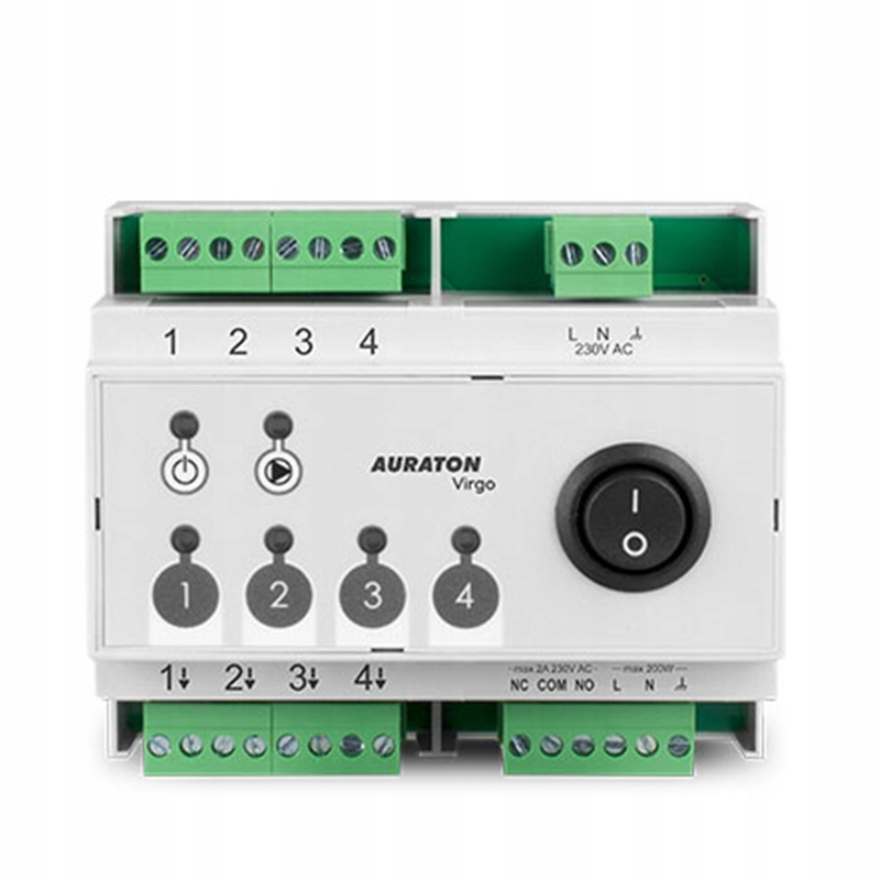 Krmilna letev za aktuatorje talnega ogrevanja, zasnovana za vgradnjo v vgradne omarice. AURATON Virgo Deluje z žičnimi regulatorji temperature. Omogoča hkratno krmiljenje črpalke centralnega ogrevanja in ogrevalne naprave.