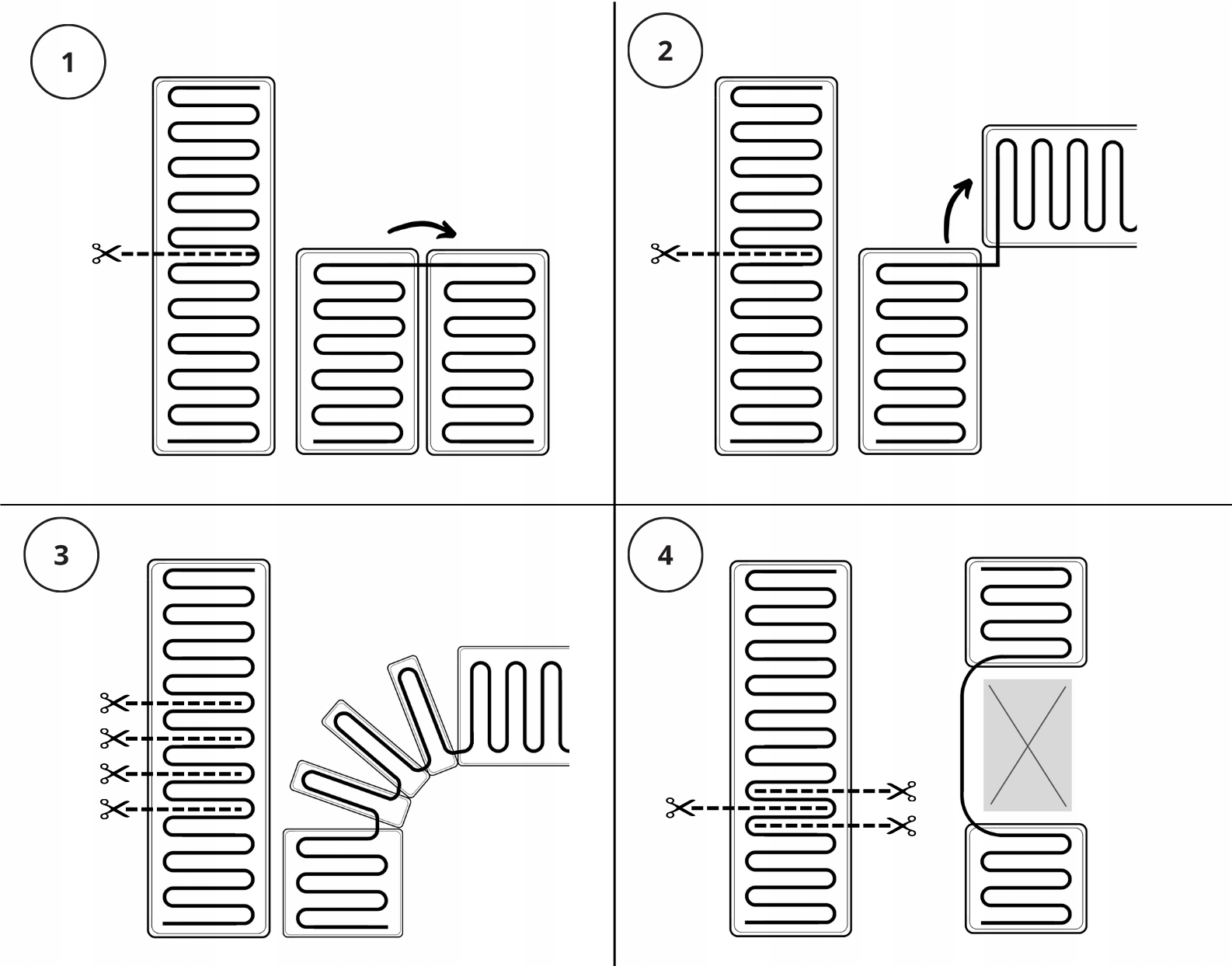 - V tesnih prostorih, kjer grelne preproge ni mogoče položiti, mrežo razrežite na ozke trakove, da omogočite poljubno razporeditev kablov.