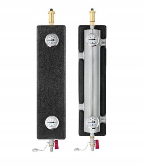 Hidravlični razdelilnik DIAMOND z razdelilnikom je zasnovan tako, da ločuje vir toplote od ogrevalnega kroga. To zagotavlja ustrezne delovne pogoje za obtočne črpalke in uravnoteženje pretoka. Omogoča tudi neodvisno delovanje posameznih krogov in nemoteno delovanje črpalk. Razdelilnik je opremljen z izpustnim ventilom, termometri in avtomatskim odzračevalnikom, ki v kombinaciji z notranjo ločilno steno pomaga pri odstranjevanju blata in odzračevanju sistema.