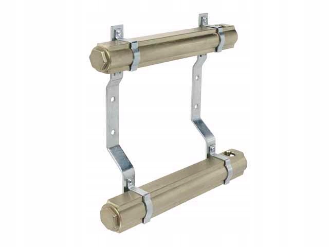 Medeninasti večtočkovni razdelilnik za talno ogrevanje ali centralno ogrevanje in oskrbo z vodo v stavbah. Opremljen z inštalacijskimi priključki.