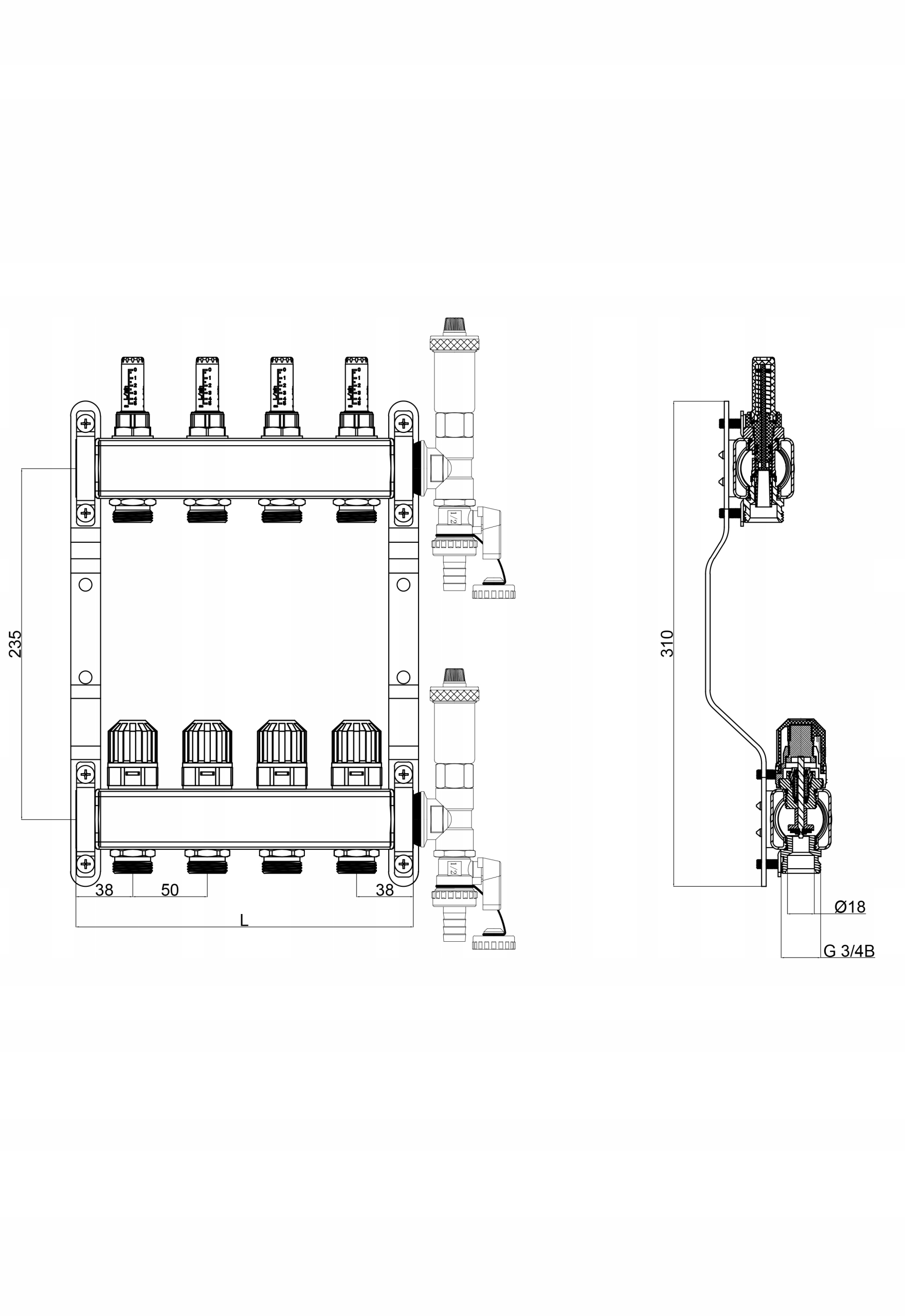 Komplet razdelilnikov iz nerjavečega jekla za talno ogrevanje v stavbah. Opremljen z: inštalacijskimi priključki, odzračevalnimi ventili centralnega ogrevanja DN15-P, krogličnimi ventili za odtok centralnega ogrevanja DN-15P, termostatskimi ventili brez glav DN15-K, indikatorji pretoka 0,5–5l/min, montažnimi nosilci.