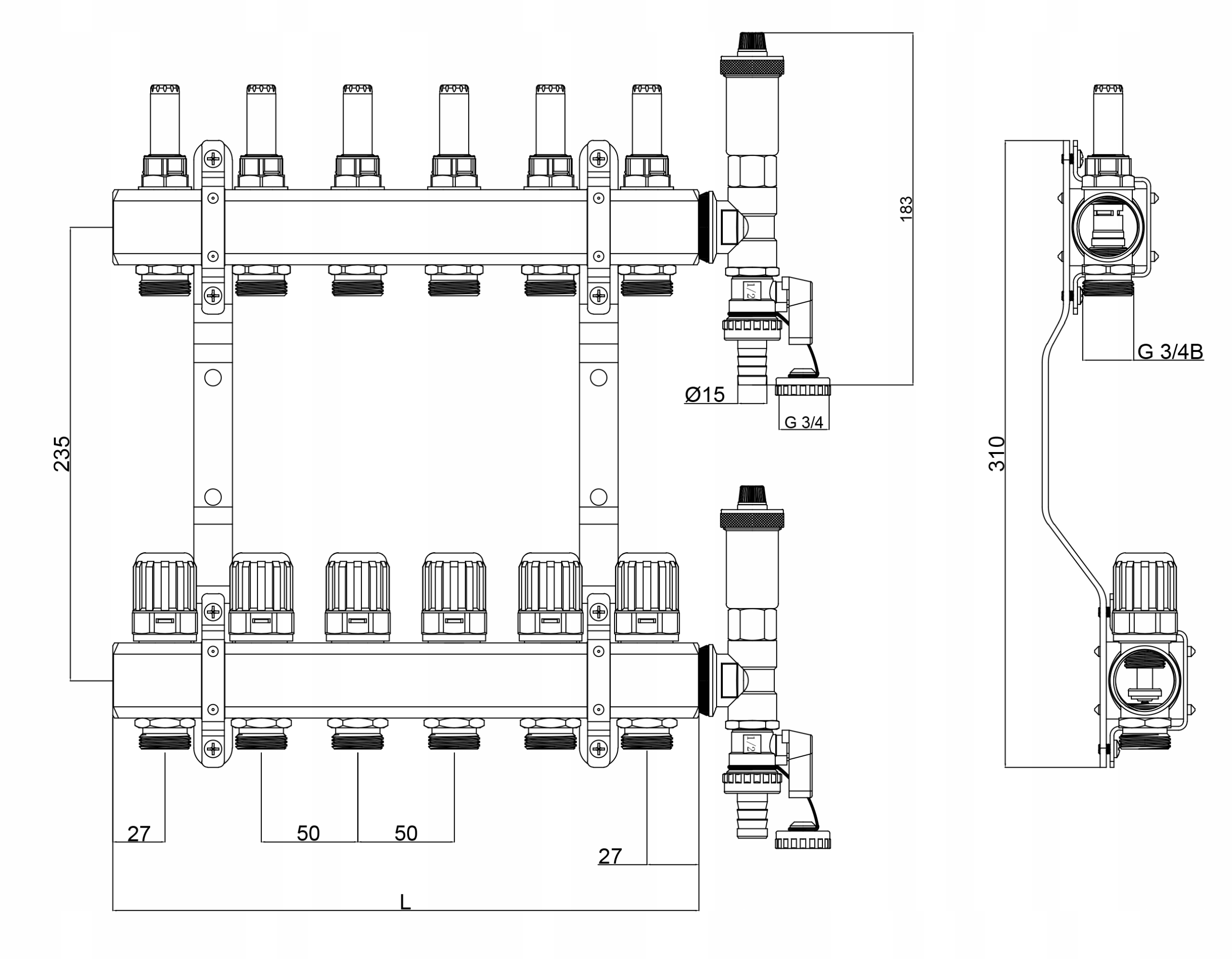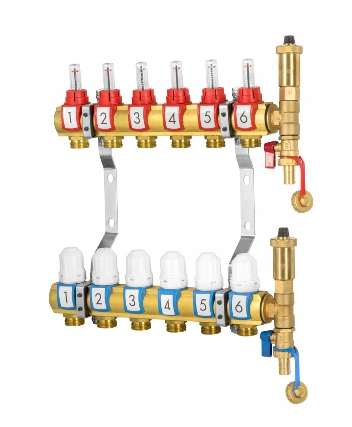Komplet razdelilca iz medenine za talno ogrevanje v stavbah z zapornimi ventili. Opremljen z: inštalacijskimi priključki, odzračevalnim ventilom centralnega ogrevanja DN15-P, krogličnim ventilom centralnega ogrevanja DN-25/15P, termostatskim ventilom brez glave DN15-K, termometrom, indikatorjem pretoka 0,5–5l/min., montažnim nosilcem.