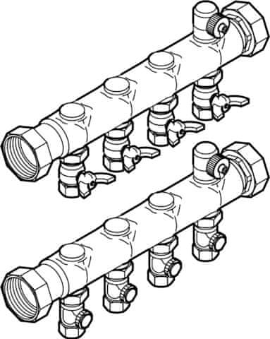 Industrijski razdelilnik DN40 – za naslednje izdelke in uporabo: Površinsko kaljenje Fonterra – nerjaveče jeklo – prekrivna matica G2, vhod/izhod: navoj Rp – ravno tesnilo Oprema en cevni priključek na vsaki razdelilnikovi tirnici, pokrovčki, priključek z leve in desne. Celoten opis