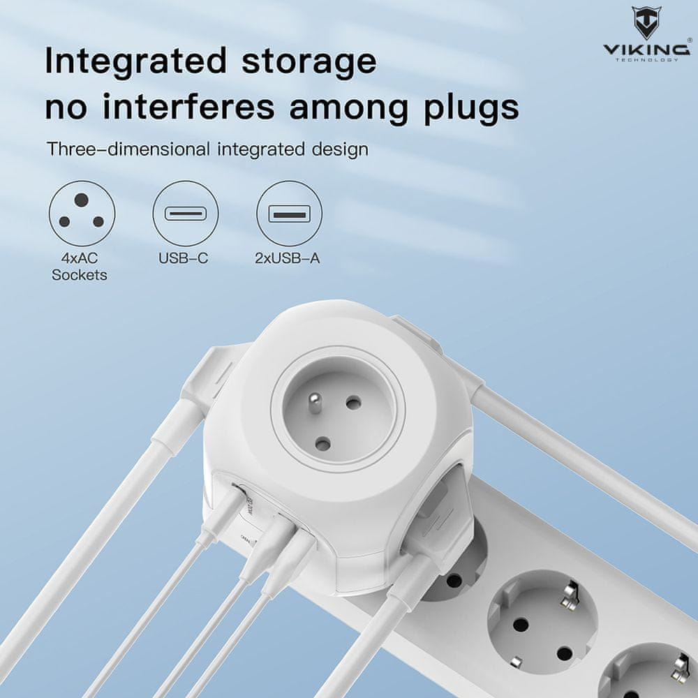 Tehnične specifikacije: Model: Viking AC43 AC adapter Vhod za izmenični tok 230 V: 230 V, 16 A, 50 Hz, največja moč 3500 W. AC 230V izhod (4×): 230V, 16A, 50Hz, 3500W max. Izhod USB-A (2×): 5V/3A, 9V/2A, 12V/1,5A Izhod USB-C (1×): 5V/3A, 9V/2,22A, 12V/1,67A Izhod USB-A + USB-C: 5V/3A Teža: 296 g Dimenzije: 8 × 8 × 8,1 cm