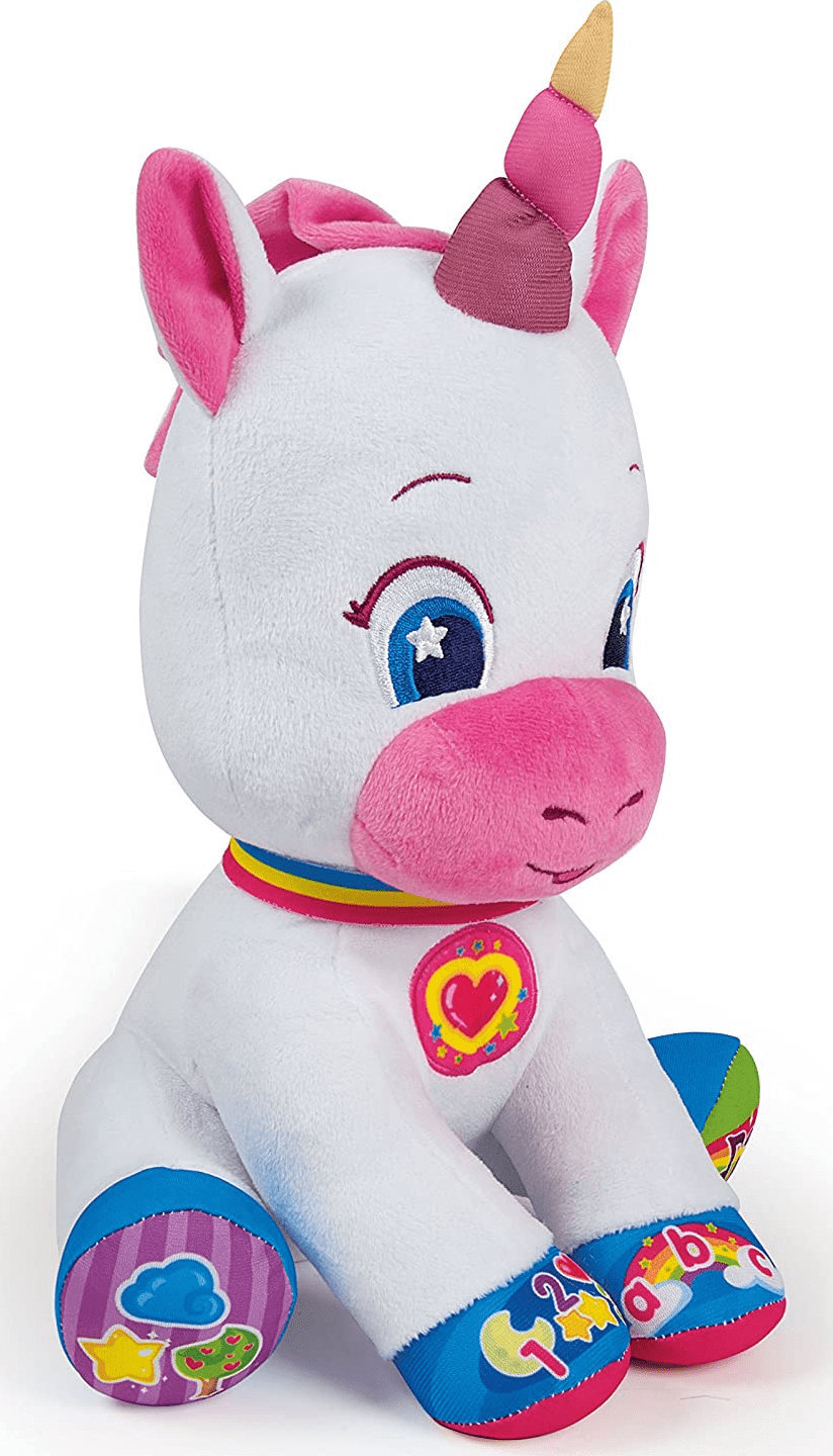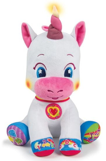 S simpatičnim enorožcem se bo vaš otrok zabaval in se naučil veliko novih stvari! Enorožec ima 5 interaktivnih gumbov za učenje prvih številk, črk, oblik in barv. Z očarljivimi pesmicami in veselimi rimami naučite otroka novih besed. Slikovni gumbi so nameščeni na tačkah in se ob pritisku odzovejo. Enorožčeva lica in rog se svetijo. Igrača govori češko (lahko tudi slovaško). Igrača potrebuje 2 bateriji AAA, R03, ki sta priloženi. Blagovna znamka BABY CLEMENTONI je sinonim za ustvarjalnost, navdušenje in poudarek na kakovosti. Igrače staršem pomagajo pri komunikaciji z otrokom. Videz igrače in njene inovativne barve, nestrupeni in trdni materiali, izklesana površina ter različne funkcije pomagajo pri razvoju taktilnih in slušnih spretnosti, pomagajo pri motorični dejavnosti in sprožajo prve logične asociacije.