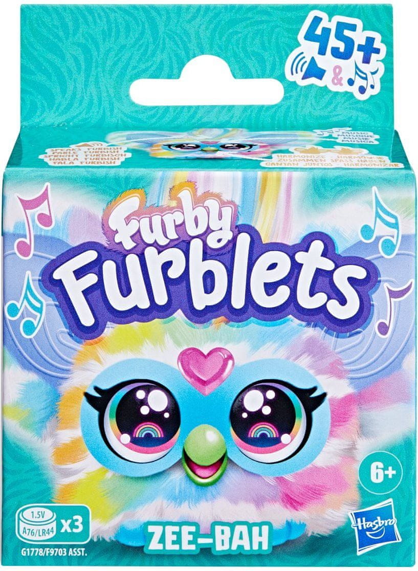 Furblet Zee-Bah igra veselo glasbo. Več kot 45 zvočnih odzivov: Furbleti govorijo furbski jezik, proizvajajo smešne zvoke in pojejo izvirne melodije. Lahko se usklajujejo, skupaj prepevajo pesmi in sodelujejo z veliko igračo Furby. Zahvaljujoč snemljivi sponki lahko Furbleta preprosto pripnete na nahrbtnik ali torbo. Za delovanje so potrebne 3 kosi baterij LR44 (vključene).