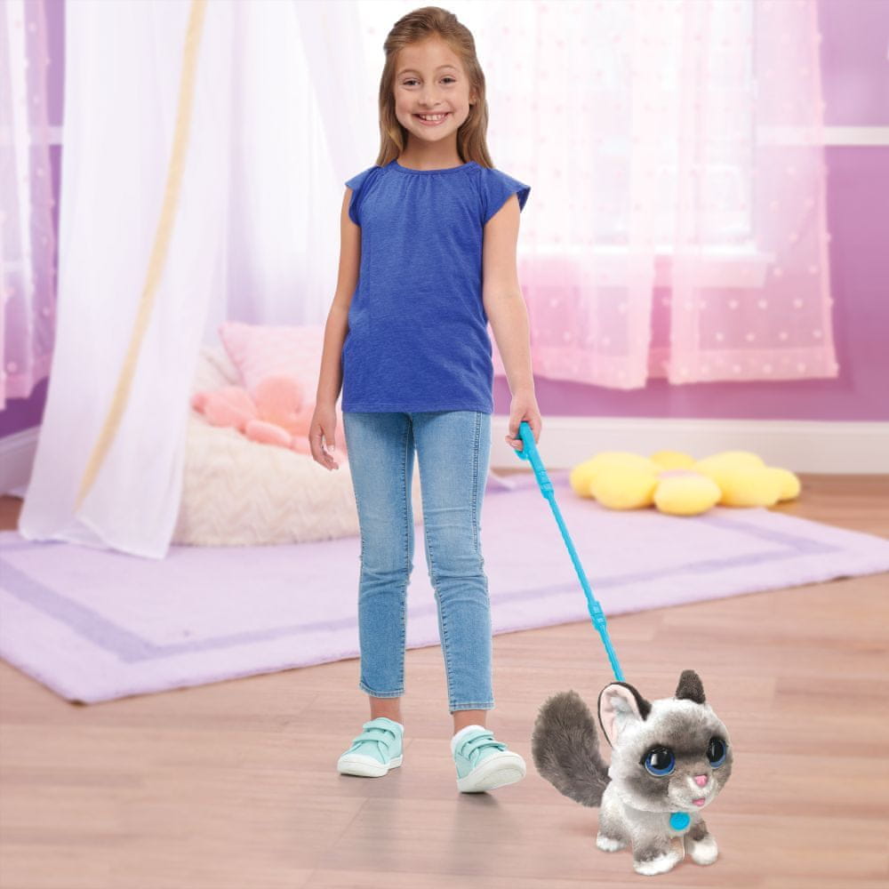 Interaktivna mucka na povodcu je odlična igrača iz serije FurReal. Mačka bo odličen partner za vašega otroka. Vse, kar morate storiti, je, da ga odpeljete domov in mu namenite nekaj ljubezni. Ta interaktivni hišni ljubljenček je zelo podoben pravi mački. Narejena je iz pliša, ki je zelo prijeten na otip. Maček se rad crklja, ima gibljivo glavo ter mijavkanje in prepevanje. Celoten komplet vključuje plastični povodec, s katerim lahko mačka peljete na sprehod.