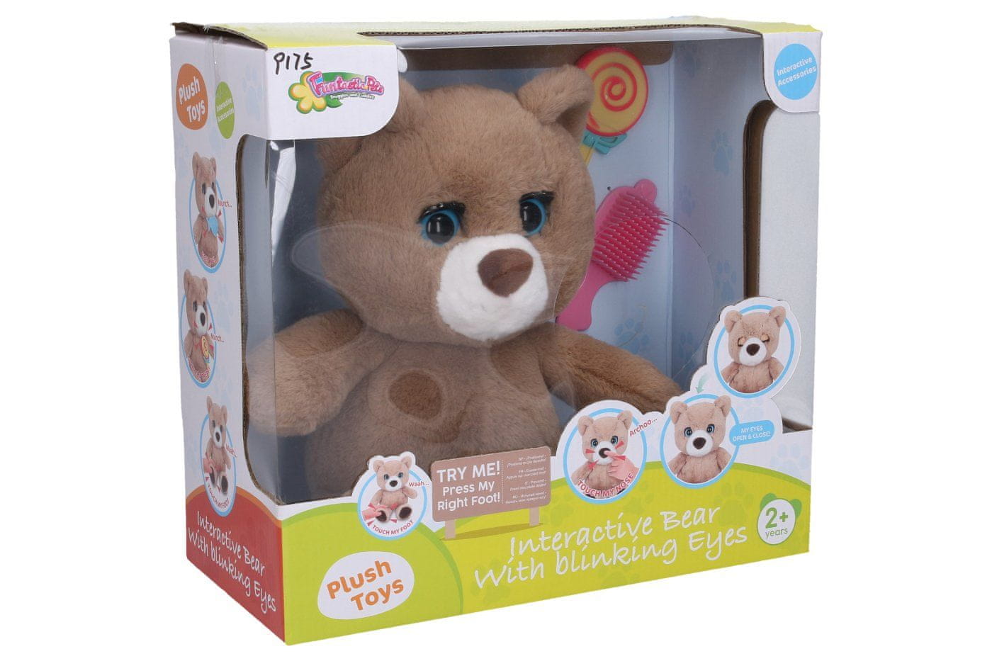 Interaktivni set medvedov. Velikost sedeža 27 cm. Zvočni učinki in mežikanje s stiskanjem leve roke in nanašanjem predmetov ali dotikanjem (pritiskanjem) drugega dela telesa – glava, smrček (kihanje), prsni koš (smeh). 3× hiter dotik glave – zapre oči in zaspi. Pripenjanje lizike in ribe na usta – prehranjevanje. 3×AA baterije so priložene. Stikalo za vklop/izklop/izkusi me na zadnji strani glave. Priložen je glavnik za česanje.