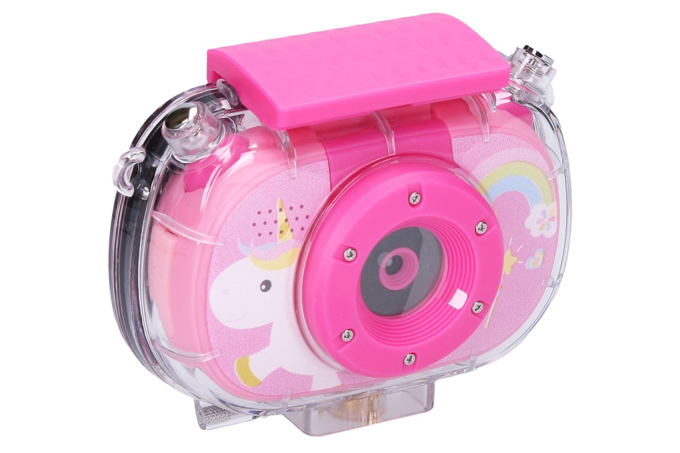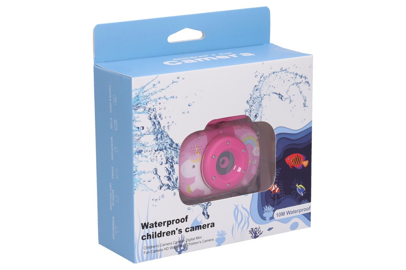 Detski digitalni fotoaparat z vodotesnim ohišjem – fotografije 20 milijonov pik na palec, videoposnetki Full HD. Dimenzije 8×2,5×5,5 cm. Nagibni objektiv – služi tudi kot kamera za selfije. Ločljivost fotografije 20 megapikslov, video Full HD (1920×1080). sprednja/selfie kamera, časovnik, neprekinjeno fotografiranje, digitalna 10-kratna povečava, vstavljanje časa, različni učinki (okvirji, vdelane animacije, filtri) fotografij, igre, predvajalnik mp3, 2,0-palčni zaslon. Vgrajena litij-ionska baterija, kabel USB, trak in vodotesno ohišje so priloženi. Format fotografij jpg, format videoposnetkov avi. Vodotesno ohišje je zasnovano za največjo globino 10 m. Delovanje 100 min. Združljiv s karticami micro SD – največ 32 GB. Pomnilniška kartica ni vključena.