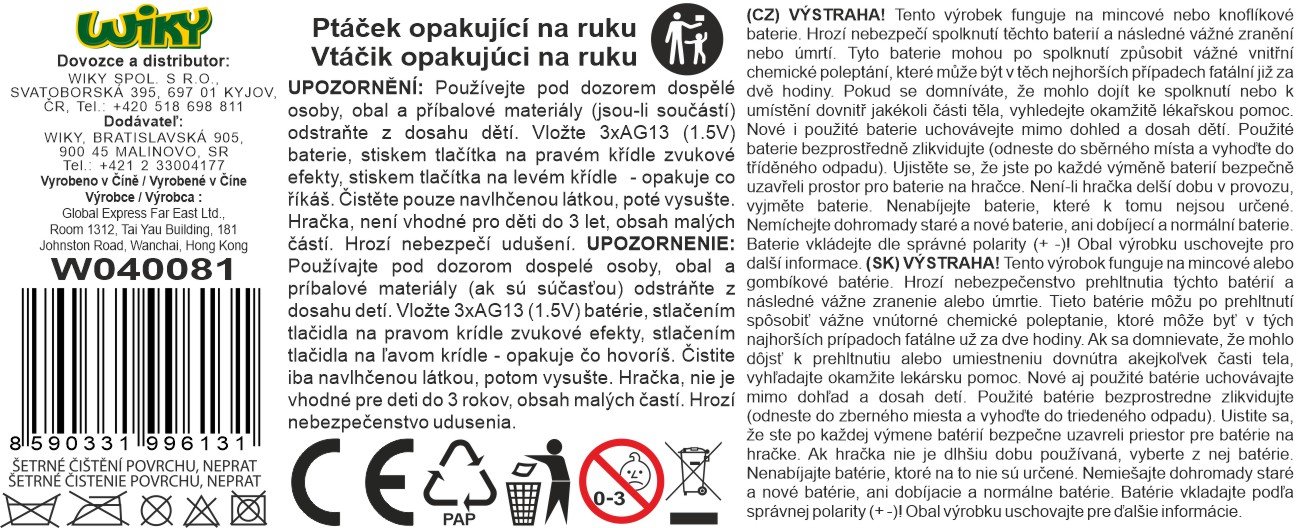 Ptič ponavlja na roki. Velikost 17 cm. Zvočni učinki. Gumb na desnem krilu – ptičje petje, gumb na levem krilu – ponavlja, kar rečete. 3×AG13 priložene baterije.