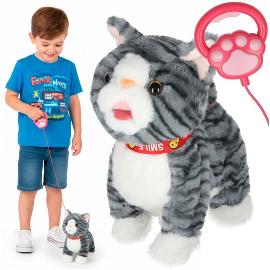 Prijazen mucek s priloženim povodcem – siva dlaka je prijetna na dotik in spodbuja božanjeLahko ga božate – ko mucka pobožate po glavi, bo začel mijavkati in premikati rep in jezikMucek hodi naprej in igra pesmice – po pritisku na gumb na povodcu mucek začne hoditi naprej in hkrati igra vesele melodijePrijazna igrača za otroke od 3. leta starosti – plišasti mucek s povodcem bo vašemu otroku pokazal, kako skrbeti za hišnega ljubljenčkaLahko ga podarite svojemu otroku kot darilo – mucek v pisani škatli bo zagotovo razveselil najmlajšeTa interaktivni mucek hodi na povodcu in ko ga pobožate, mijavka in se premika. Plišasta igrača se obnaša kot pravi hišni ljubljenček. Z njim lahko preprosto pokažete svojemu otroku, kako je skrbeti za mucka. Plišasta igrača krepi socialne veščine in empatijo.