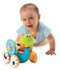 Gibajoči se polžek z veselo melodijo in vrtečo se barvno školjko spodbuja otroka, da se še naprej plazi za njim.
