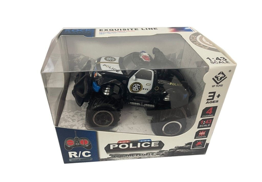 Policija vozi naprej, nazaj, zavija desno in levo. Svetlobni učinek, velike pnevmatike. Največja hitrost 5,4 km/h. Frekvenca 27 MHz, frekvenčni pas 27,045–27,245 MHz, največja moč radijske frekvence 80DB, doseg daljinskega upravljalnika 15 m.