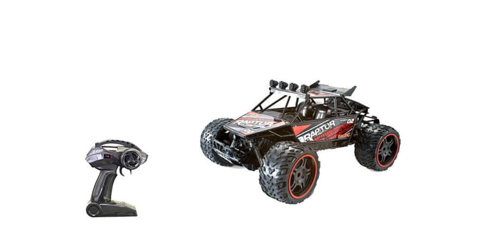 Tovornjak RC Monster Truck v merilu 1:10 je robusten in zmogljiv model, zasnovan za zahtevno vožnjo po različnih vrstah površin. Ta monster truck je opremljen z masivnimi pnevmatikami z značilnim tekom, ki zagotavljajo dober oprijem in stabilnost tudi na neravnem terenu. Karoserija ima športno obliko z značilnimi napisi „RAPTOR“ in „PANITER“ ter je na voljo v dveh barvnih različicah – rdeči in modri detajli na črni podlagi, kar tovornjaku daje dinamičen in agresiven videz. Na strehi so nameščene štiri luči, ki dodajajo pristnost in poudarjajo terensko naravo vozila.