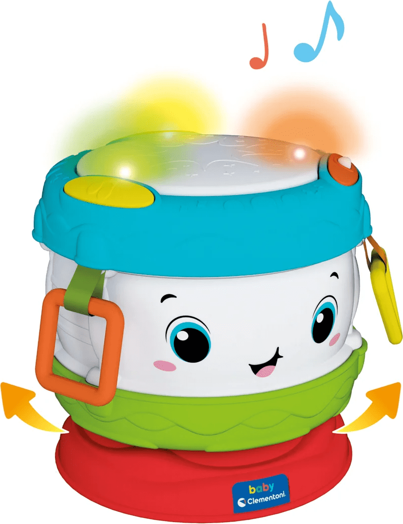 S pritiskom na gumb na okvirju bobna lahko otrok posluša veliko zabavnih zvokov in melodij. Hitrost glasbe se spreminja glede na vrtenje bobna, kar ustvarja svetlobne in zvočne učinke. S pritiskom na zgornji del bobna lahko otrok prisluhne številnim različnim zabavnim zvokom. Zahvaljujoč luči LED pod zgornjim delom bobna bodo svetlobni učinki pritegnili otrokovo pozornost in vzbudili njegovo radovednost, ko se bo igral z bobnom. Priročni ročaji so izdelani iz plastike in imajo reliefne podrobnosti, ki spodbujajo raziskovanje z otipom. Sesalec pod dnom bobna ohranja igračo stabilno tudi med vrtenjem.