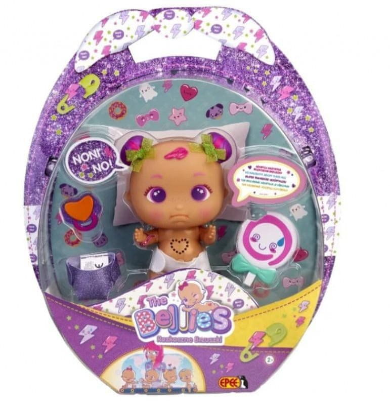 Simpatični dojenčki Bellies iščejo nov dom. Interaktivni dojenčki žvrgolijo in njihova srca bijejo. Vsak ima edinstveno materino znamenje. Dojenčka Noni-No in Kuku-Cute imata edinstvene bleščeče plenice in izvirne dodatke. Vsebina paketa: punčka, dudica, bela plenička, bleščeča plenička, steklenička ali lizika, potrdilo o posvojitvi . mešanica dveh motivov brez možnosti izbire: Noni-No in Kuki-Cute. Za otroke od 2. leta starosti.