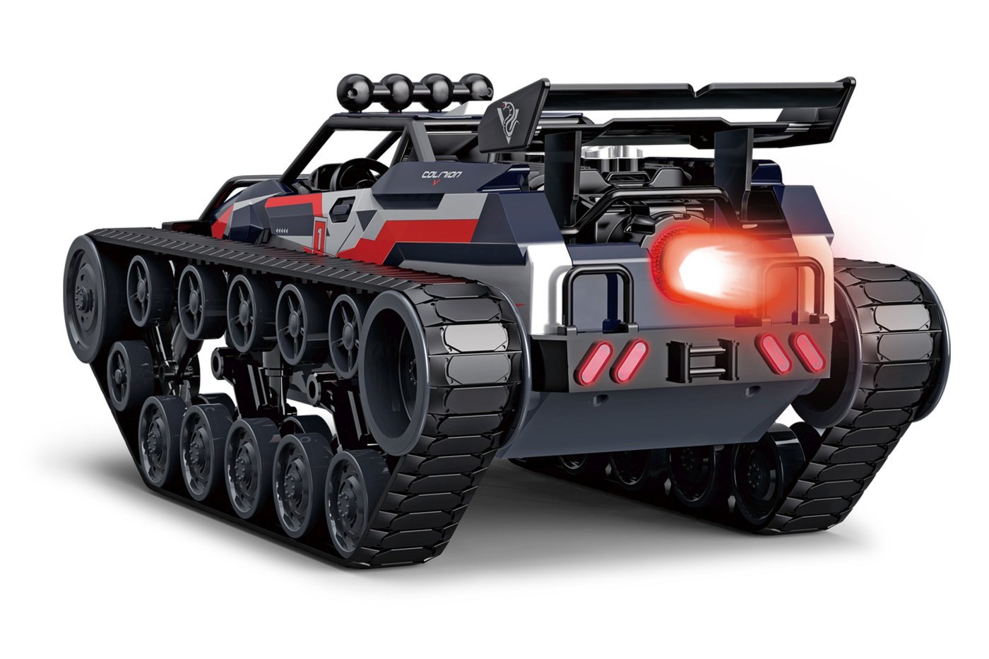 Kovinski pas za kajenje RC daljinski upravljalnik. Dimenzije 35×17,3×15 cm. Frekvenca 2,4 GHz. Pištola za upravljanje. Vzpenjanje do 30 stopinj. Doseg 50 m, delovanje 15 min, polnjenje 180 min. Svetlobni (sprednje, zadnje in strešne luči) in dimni učinki. 7,4V baterija za vozilo je vključena, 3×AA za krmilnik ni vključena. Priložena sta kabel USB in posoda za vodo. Stikalo za vklop/izklop na spodnji strani vozila, gumb za vklop/izklop in gumb za dimne učinke na vozniku. Posoda za vodo na vrhu pred krilom.