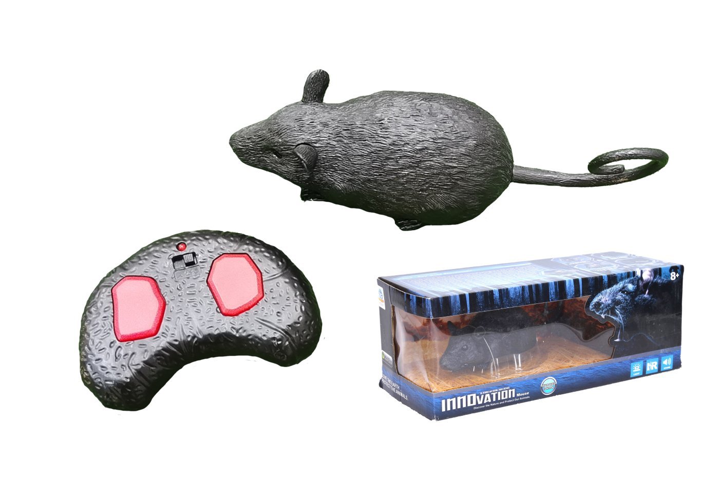 RRCross RC daljinski upravljalnik. Velikost 22 cm. Infrardeča vrata, kanal A, B, C. Svetlobni učinki. 2×AAA baterije za podgano, 3×AAA za krmilnik niso vključene. Stikalo za vklop/izklop na spodnjem delu podgane. Levi gumb – premikanje naprej, desni gumb – vrtenje. Držite oba gumba 7 sekund – demo funkcija, levi gumb prekine delovanje. Ročno odpiranje ust.