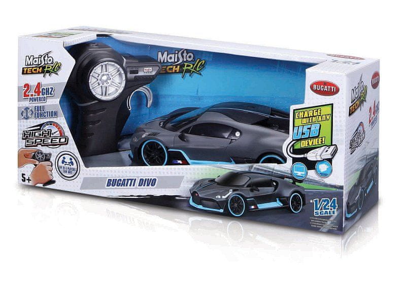 Bugatti Divo 1:24 RC Premium. Model športnega avtomobila Maisto z daljinskim upravljalnikom. Avtomobil ima vgrajeno litijevo baterijo, ki jo je mogoče polniti prek kabla USB (priložen). Upravljalnik deluje na baterije 2×AAA (priložene). 2,4 GHz – do 4 osebe. Voznik s pištolo. Doseg upravljanja do 35 m. Čas polnjenja 45 minut. Dimenzije paketa: 13,3 × 31,75 × 11,1 cm. 5+