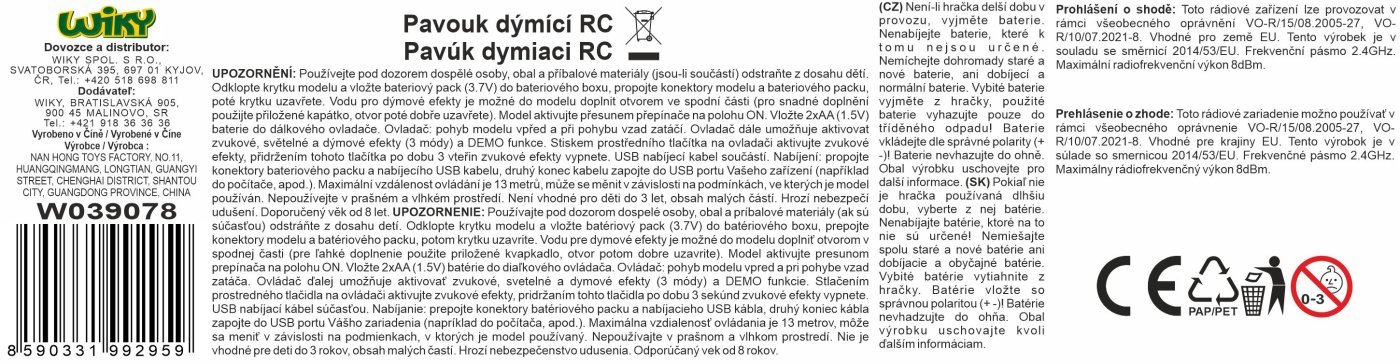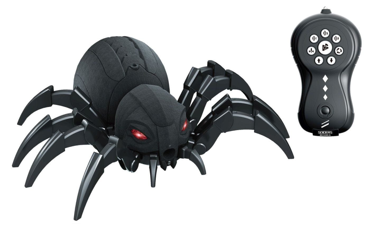 Kadilski pajek na daljinski upravljalnik RC. Dimenzije 30×28×10 cm. Frekvenca 2,4 GHz. Svetlobni, zvočni in dimni učinki. Gumbi na krmilniku – hoja naprej, vzvratni zavoji, 3 načini dimnih učinkov, 2 demo načina, zvok. 3,7V baterija za pajka je priložena, 2×AA za krmilnik ni priložena. Rezervoar za vodo na dnu pajka. Priložen je kabel USB in posoda za vodo.
