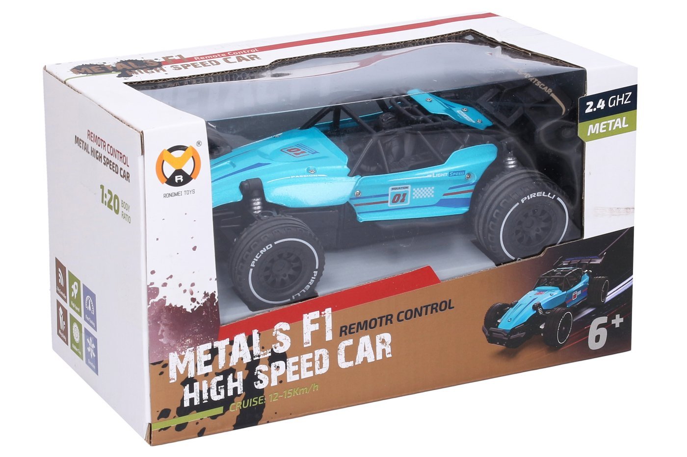 Kovinska formula za daljinski upravljalnik RC. Velikost 21 cm. Frekvenca 2,4 GHz. Pištola za upravljanje. Vključena baterija 3,7 V, krmilnik 2×AA ni vključen. Priložen je kabel USB. Stikalo za vklop/izklop na krmilniku in spodnjem delu formule.