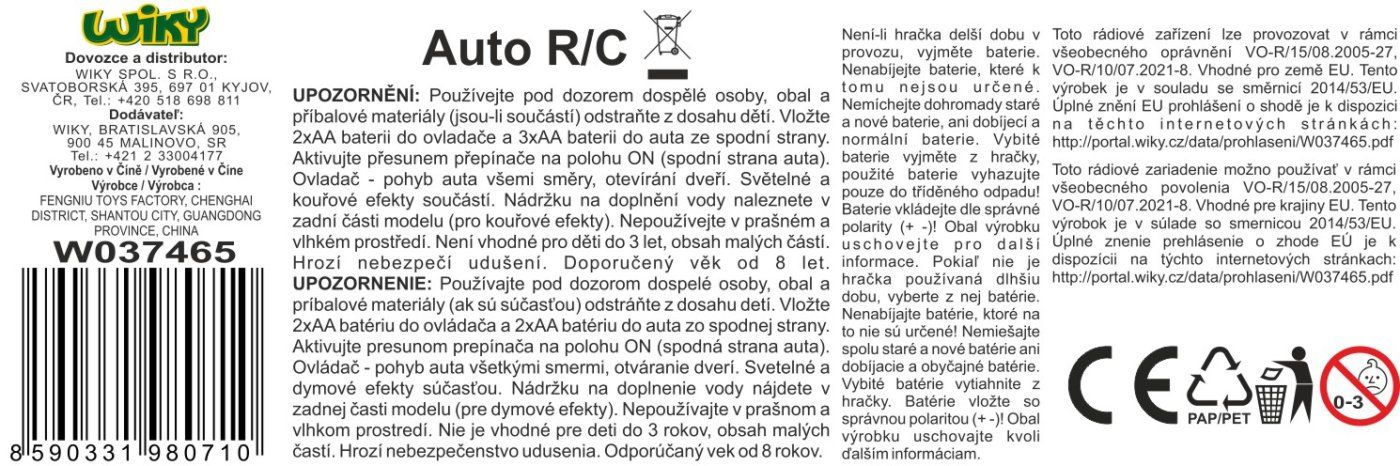 Policijski avto RC z daljinskim upravljalnikom. Velikost 21 cm. Frekvenca 27 MHz. Daljinsko odpiranje vrat. Svetlobni in dimni učinki. 3×AA baterije za avto, 2×AA za krmilnik niso vključene. Stikalo za vklop/izklop na dnu avtomobila. Gumb na daljinskem upravljalniku – odpiranje vrat. Rezervoar v zadnjem delu pred krilom. Priložen je rezervoar za vodo.