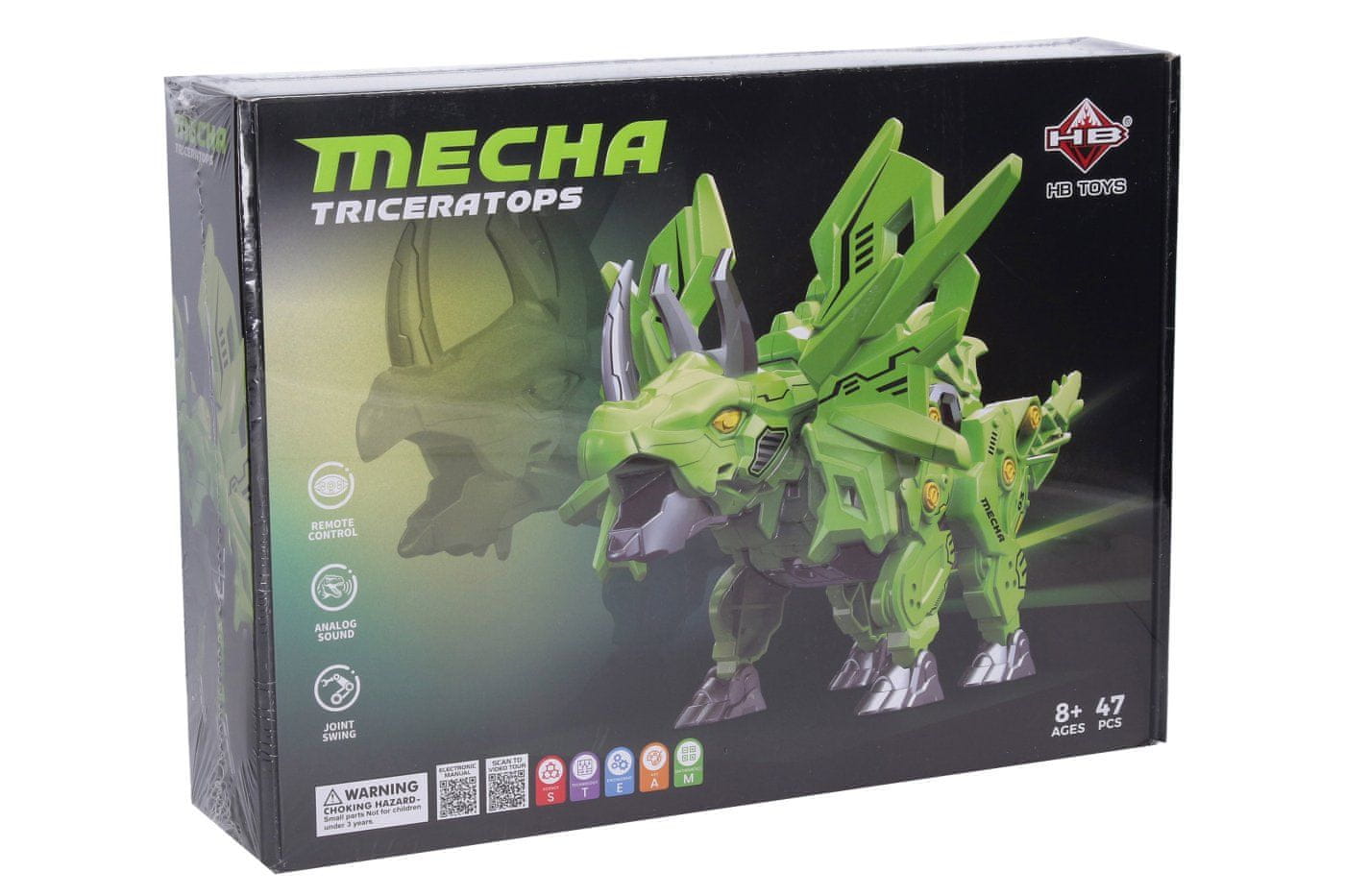 Rc dino robotski komplet Mecha Triceratops. Dimenzije zloženega robota 23,7×12,8×13,2 cm. Frekvenca 2,4 GHz. Ustvarja zvočne učinke. Upravljanje – levi gumb – gibanje naprej, desni gumb – gibanje nazaj, srednji gumb – zvočni učinki. Shema sestavljanja na embalaži. Gibljiva rep in glava. Komplet vsebuje 47 delov. Robot – baterije 2×AAA, niso priložene. Krmilnik – baterije 2×AAA, niso priložene.