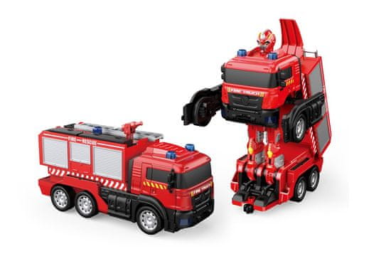 Avtorobot na daljinsko upravljanje RC. Preobrazba v gasilski avto. Velikost 26 cm. Vodni top, aktiviranje s pritiskom na svetilnik, rezervoar za vodo na zadnji strani strehe. Gibanje v vseh smereh, preoblikovanje z gumbom. Frekvenca 40 MHz. Robot – 1×3,7V baterija (vključena), krmilnik – 2×AA (ni vključena). Priložen je polnilni kabel USB.