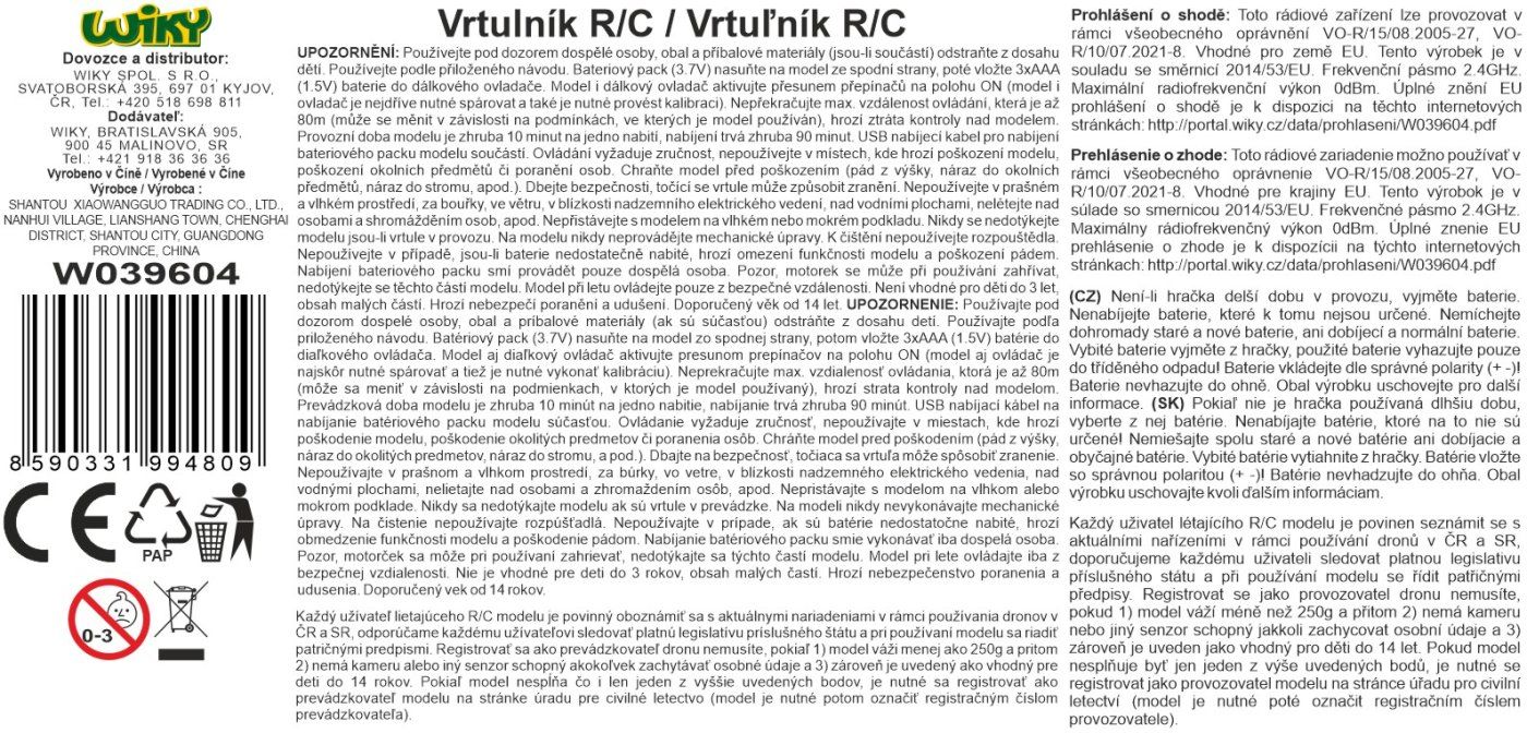 Radijski helikopter na daljinsko upravljanje. Brez kamere. Dimenzije 25×5×12 cm. Kovinska konstrukcija. 3,7V 500mAh baterija za helikopter je priložena, 3×AAA za krmilnik ni priložena. Priložen je kabel USB. Delovanje 10 min, polnjenje 90 min, doseg krmilnika 80–100 m. Funkcija – premikanje na mestu, vrnitev v začetni položaj. Stikalo za vklop/izklop na krmilniku.