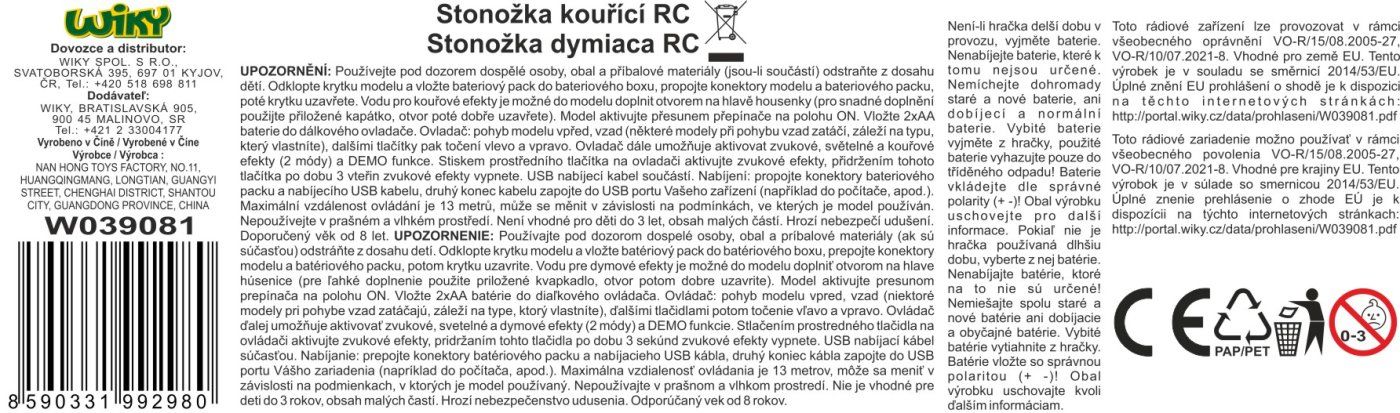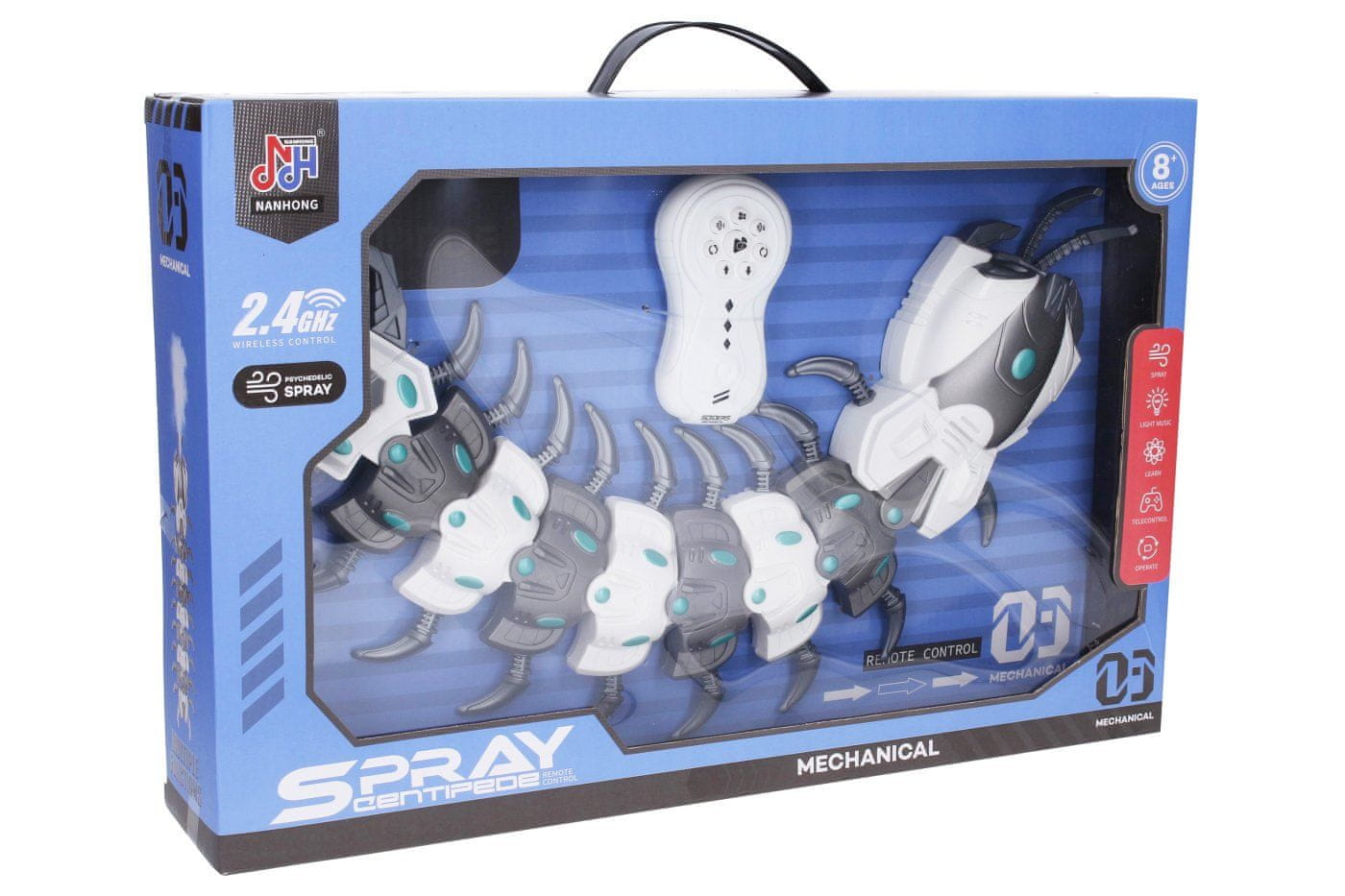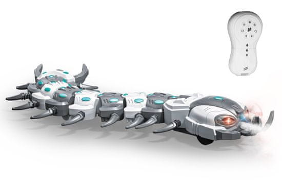 Radijska nogavica za kajenje z daljinskim upravljalnikom. Dimenzije 53×15×5 cm. Frekvenca 2,4 GHz. Svetlobni, zvočni in dimni učinki. Gumbi na krmilniku – hoja naprej in nazaj, vrtenje levo in desno, 2 načina dimnih učinkov, zvok, demo način. 3,7V baterija za gosenico je priložena, 2×AA za krmilnik ni priložena. Stikalo za vklop/izklop na spodnjem delu gosenice. Rezervoar za vodo na dnu glave. Priložen je kabel USB in posoda za vodo.