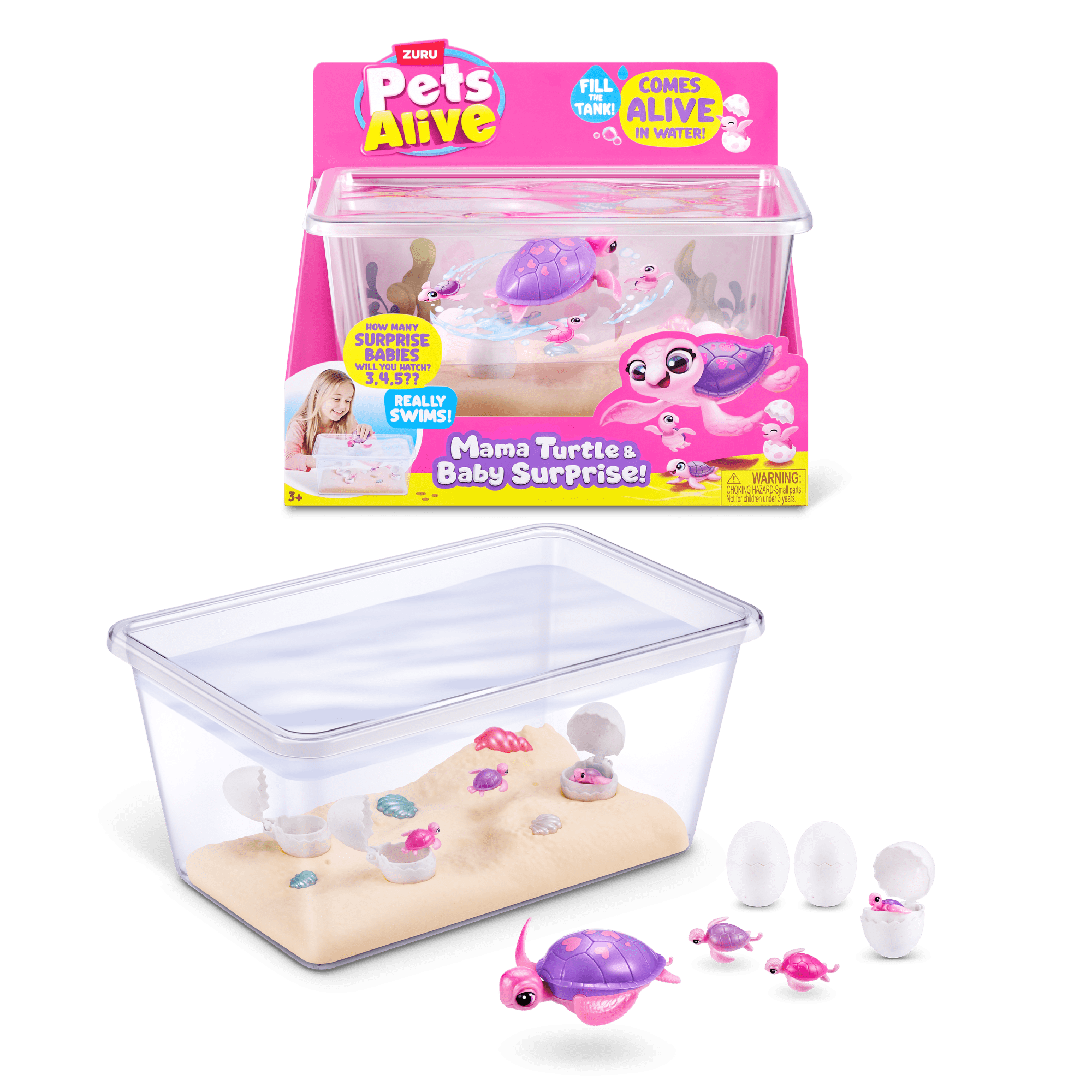 Ta čudovit igralni set prinaša nepozabno izkušnjo, saj tvoja Mama želva ni le navadna igrača, ampak skrbna mama, ki v svojem realističnem akvariju izvali presenečenje. Ko akvarij napolniš z vodo, Mama želva oživi in graciozno zaplava, hkrati pa se odlično znajde tudi na kopnem, kjer rada pohajkuje.