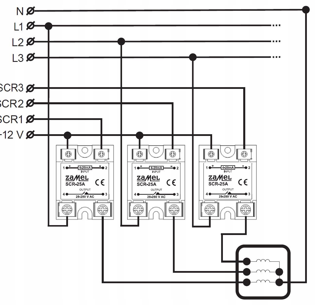 • aktuatorski del – opremljen s trifaznim regulatorjem z analognim vhodom (SCR – 25A) – upravlja obremenitev priključenega sprejemnika,