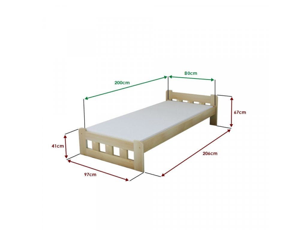 Šířka postele 80 x 200 cmEnojna postelja dimenzij 80 × 200 cm se najpogosteje uporablja v otroških sobah, študentskih stanovanjih ali študentskih domovih. S svojo širino 80 cm je primerna za manj zahtevne osebe in otroke. Prihrani prostor, zato je primerna za manjše spalnice ali sobe. V kolikor se tudi vi ubadate s prostorskim problemom v mali garsonjeri, potem je točno ta postelja odlična izbira, poleg tega lahko uporabite drsno škatlo za shranjevanje pod posteljo.