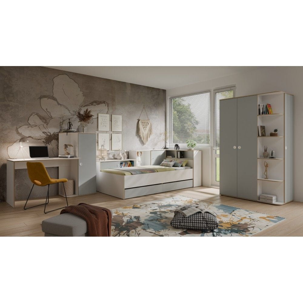 Postelja PINIO 90×200 cm je praktična in moderna rešitev za študentsko sobo, kjer se udobje združuje s pametnim prostorom za shranjevanje. Izdelana je iz trpežne laminirane DTD debeline 1,6 cm v kombinaciji bele in sive barve z obrobo v odtenku svetlega hrasta trufel. Eleganten videz dopolnjujejo beli plastični ročaji, ki olajšajo rokovanje. Postelja je univerzalna, zato jo lahko po potrebi postavite na levo ali desno stran. Ponuja dva prostorna predala na kolesih (99,4×17,5 cm, notranji prostor 92×51,5 cm, nosilnost 10 kg), ki sta idealna za oblačila ali posteljnino. Na voljo je tudi odprt prostor za shranjevanje s policami (nosilnost 5 kg) in drsna vrata, ki omogočajo enostaven dostop do shranjenih stvari. Del postelje je letveno dno iz treh letvic. Postelja je dobavljena brez vzmetnice, priporočamo vzmetnico 90×200 cm z minimalno višino 18 cm; konstrukcija je prilagojena za vgradnjo vzmetnice v globino 15 cm. Nosilnost postelje je 100 kg na osebo, kar zagotavlja varno in udobno uporabo. Skupne dimenzije postelje so (ŠxGxV): 231,5×125,5×88,5 cm, zaradi česar je praktičen in estetski kos pohištva. Zahvaljujoč modernemu dizajnu in velikemu prostoru za shranjevanje je idealna izbira za študentske sobe. Dostavljena je v razstavljenem stanju za lažjo manipulacijo in montažo doma.