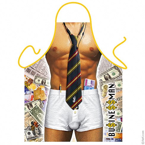 Predpasnik Business Man ima poslikavo izklesanega moškega telesa v spodnjicah, ki ga iz vseh strani krasi denar. Popestrite srečanja z zabavnim predpasnikom, ki vam bo v pomoč pri kuhinjskih opravilih.