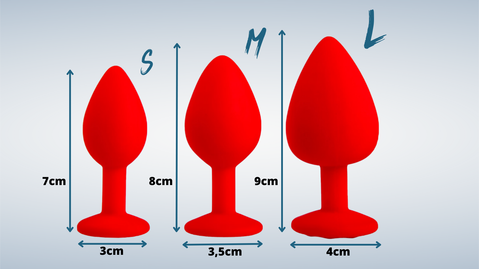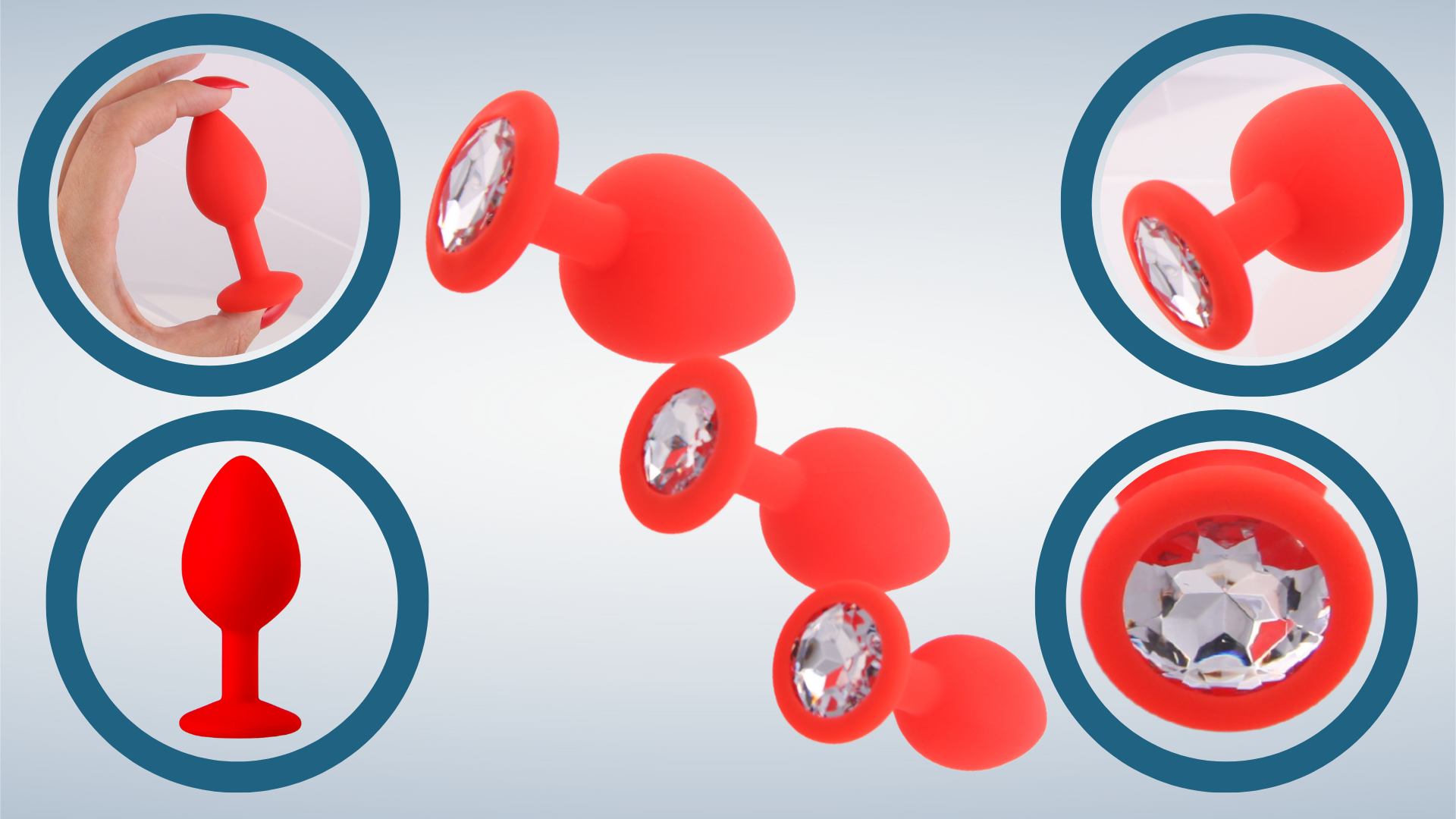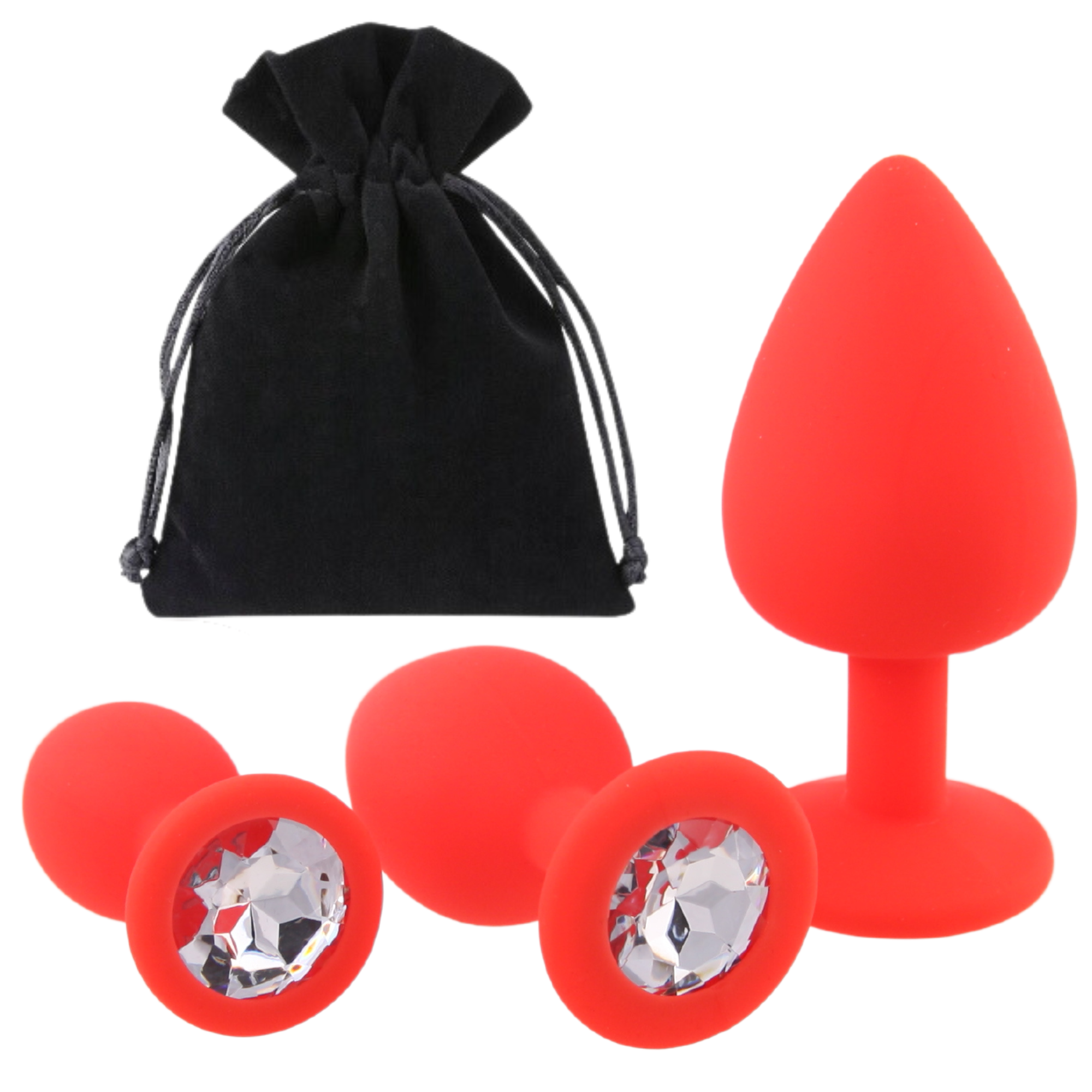 Ta komplet treh rdečih analnih čepov, okrašenih s kristali, je analna igrača za ljudi vseh stopenj znanja. Je popoln vadbeni komplet za tiste, ki radi spolno eksperimentirajo in odkrivajo nove erogenih con. Čepi so na voljo v različnih velikostih, tako da lahko postopoma povečujete stopnjo stimulacije z naraščanjem velikosti seks igrače.