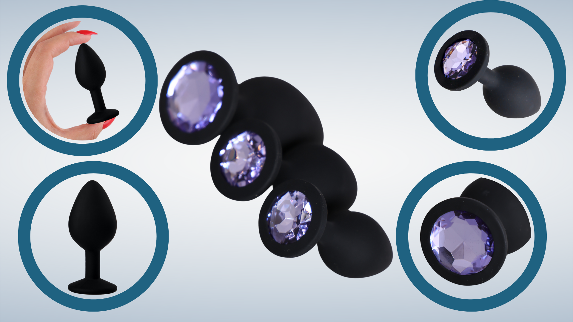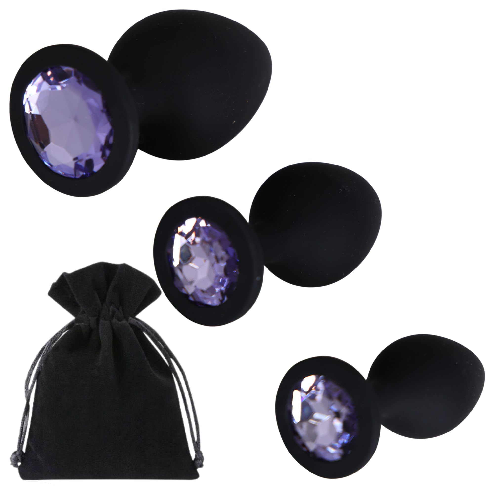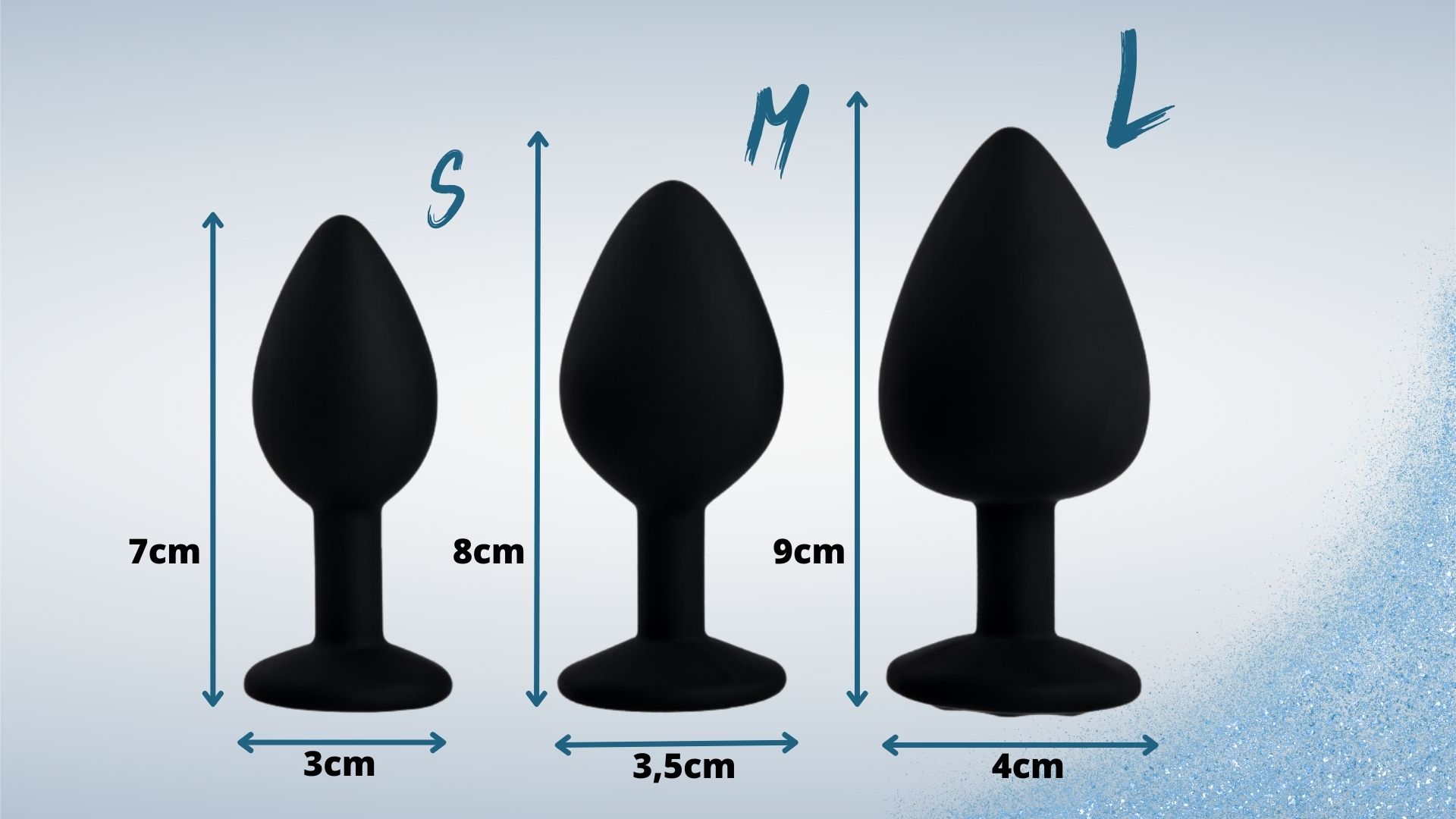 Ta komplet treh črnih analnih čepov, okrašenih s kristali, je analna igrača za ljudi vseh stopenj znanja. Je popoln vadbeni komplet za tiste, ki radi spolno eksperimentirajo in odkrivajo nove erogenih con. Čepi so na voljo v različnih velikostih, tako da lahko postopoma povečujete raven stimulacije z naraščanjem velikosti seks igrače.