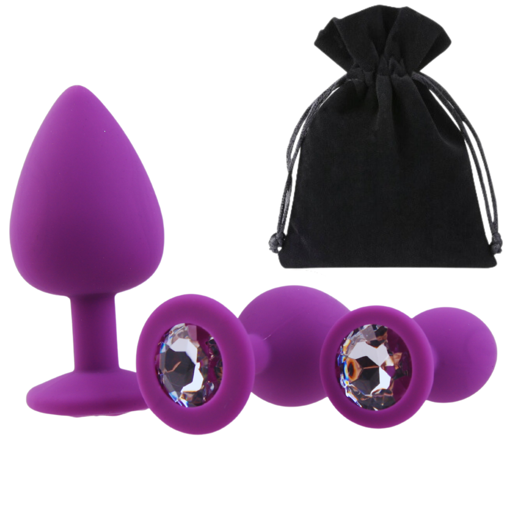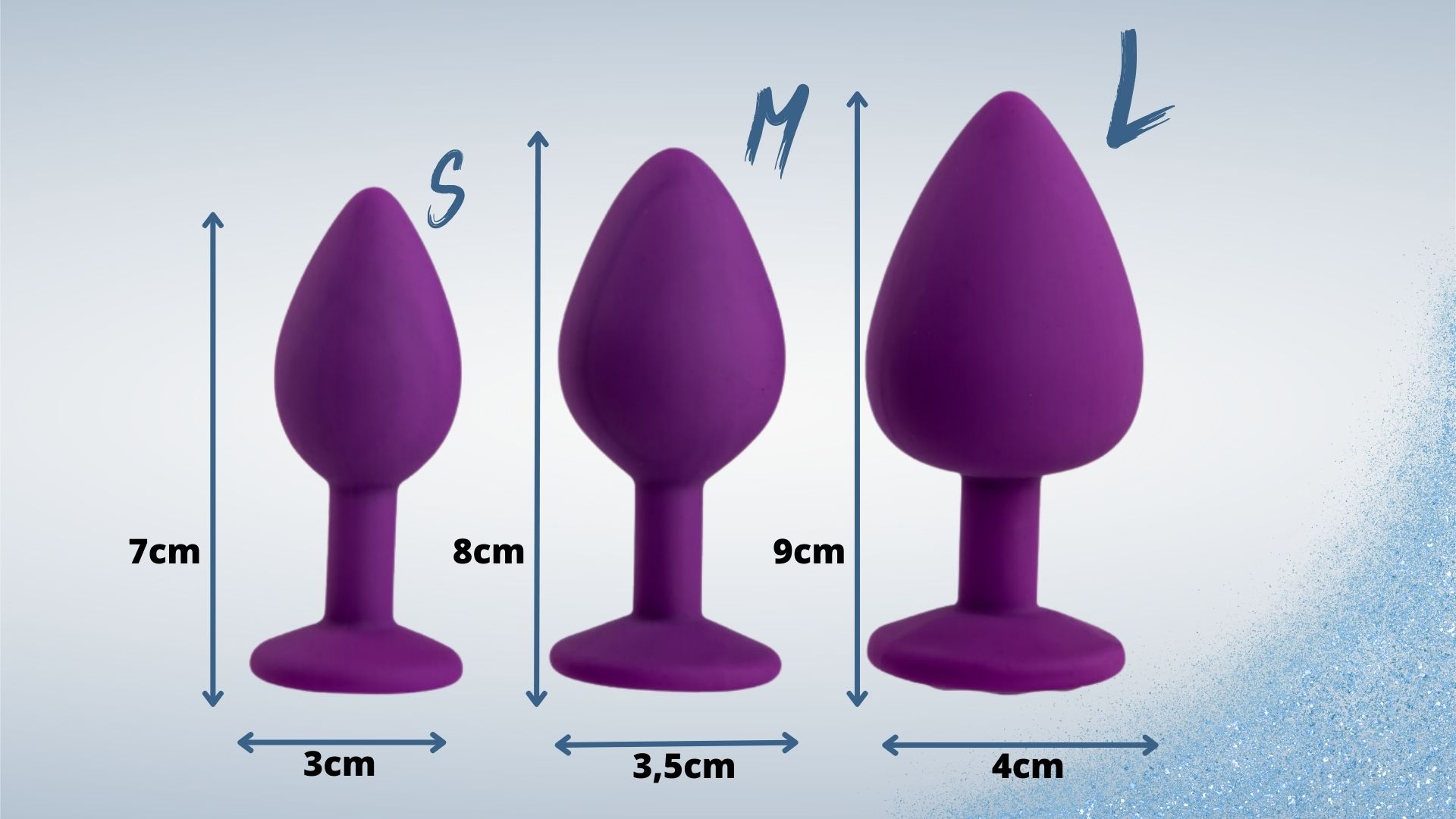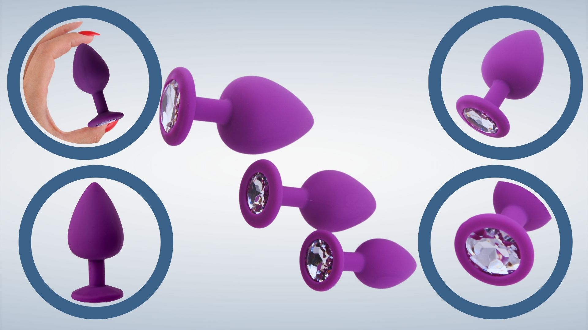 Ta komplet treh vijoličnih analnih čepov, okrašenih s kristali, je analna igrača za ljudi vseh stopenj znanja. Je popoln komplet za vadbo za tiste, ki radi spolno eksperimentirajo in odkrivajo nove erogenih con. Čepi so na voljo v različnih velikostih, tako da lahko postopoma povečujete raven stimulacije z naraščanjem velikosti seks igrače.