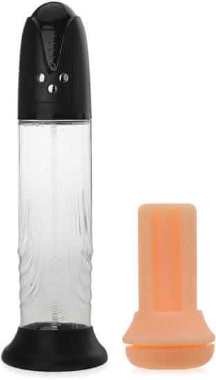 Avtomatska črpalka za povečanje penisa z večnamensko uporabo. Večnamenski erotični pripomoček za moške, ki bo izpolnil vsa pričakovanja najzahtevnejših strank. Črpalka se tradicionalno uporablja za povečanje penisa in vadbo. V ta namen je priloženo silikonsko tesnilo, mehanizem pa ima štiri nastavitve intenzivnosti sesanja. Priložen je tudi mehak ovoj iz kibernetske kože, napolnjen s stimulativnimi izboklinami. Ovoj se popolnoma prilega cilindru, in ko ga vstavite, črpalka postane sesalni masturbator za božanje in sesanje penisa. V ta namen je mehanizem opremljen s štirimi funkcijami masturbacije, ki vam bodo zagotovile intenziven orgazem. Naprava ima varnostni gumb, ki hitro sprosti zrak in uravnava tlak v cilindru. Vse komponente naprave, razen glavne krmilne enote z baterijo, so potopne in pralne.