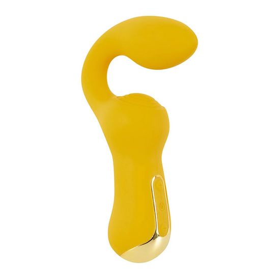 Dinamičen, rumen vibrator, ki intenzivno masira vagino s čudovito ukrivljenim, prožnim vratom in izbočeno glavico, medtem ko stimulira klitoris z vznemirljivimi vibracijami.