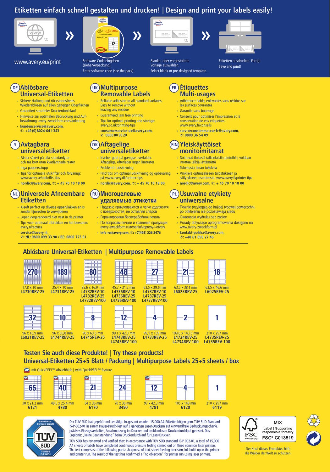 Avery Zweckform odstranljive univerzalne etikete L6028REV-25 so bele barve, velikost etiket je 105 × 148 mm. Nalepke imajo odstranljivo lepilo in se jih lahko enostavno in brez sledi odstrani. Primerne so za začasno označevanje in pogosto spreminjajoče napise. V zavitku je 100 etiket + 20 brezplačnih etiket. Etikete so okolju prijazne: imajo certifikat FSC. Za tiskanje so primerni običajni laserski in inkjet tiskalniki. Za oblikovanje etiket priporočamo uporabo brezplačnega spletnega programa Avery Design & Print.