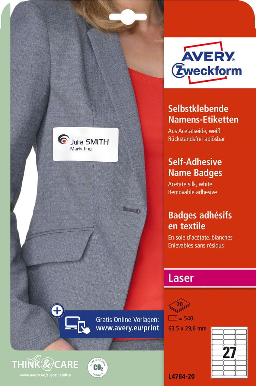 Avery Zweckform samolepilne priponke za imena L4784–20 so primerne za tiskanje z laserskimi tiskalniki. Velikost priponk je 63.5 × 29.6 mm, v zavitku jih je 540. Olajšajo organizacijo različnih prireditev, seminarjev in konferenc. Narejene so iz acetatne svile in se zanesljivo oprimejo oblačil, po uporabi pa jih je enostavno odstraniti in ne puščajo nobenih ostankov lepila. Niso primerne za uporabo na usnju, svili, žametu in drugih občutljivih tkaninah. Te priponke so odlična alternativa priponkam s sponko ali identifikacijskim karticam, ki se nosijo okoli vratu. Za oblikovanje priporočamo uporabo brezplačnega spletnega programa Avery Design & Print, ki vsebuje množico vnaprej oblikovanih predlog.