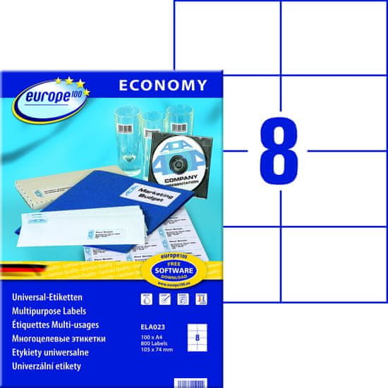 Samolepilne etikete blagovne znamke europe100 proizvaja Avery Zweckform. Bele papirne nalepke ELA023 v velikosti 105 × 74 mm imajo permanentno lepilo in dober oprijem na številnih podlagah. 800 nalepk/zavitek, 100 listov/zavitek. Za vse tiskalnike. Celoten opis