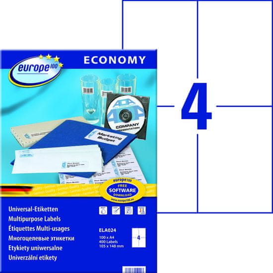 Samolepilne etikete blagovne znamke europe100 proizvaja Avery Zweckform. Bele papirne nalepke ELA024 v velikosti 105 × 148 mm imajo permanentno lepilo in dober oprijem na številnih podlagah. 400 nalepk/zavitek, 100 listov/zavitek. Za vse tiskalnike. Celoten opis