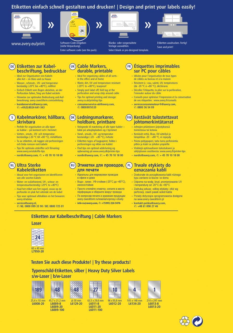 Avery Zweckform etikete za označevanje kablov L7950–20 so trpežne in odporne na vlago, umazanijo, UV žarke in temperaturo od –200 C do +800 C. Velikost etiket je 60 × 40 mm, v zavitku jih je 480. Z nalepkami označite računalniške kable in kable drugih električnih aparatov, tako doma kot na delovnem mestu. Za tiskanje so primerni običajni laserski tiskalniki. Etikete lahko oblikujete z brezplačnim spletnim programom Avery Design & Print.