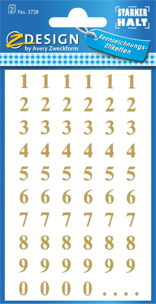 Avery Zweckform Z-Design nalepke s številkami 3728 so zlate barve, velikost etiket je 7.5 mm. Narejene so iz folije in so odporne na mehanske poškodbe. Etikete so kot nalašč za označevanje raznih predmetov tako doma kot v pisarni. V zavitku so številke od 0 do 9. Nalepke redno preverjajo neodvisni laboratoriji.